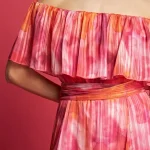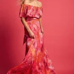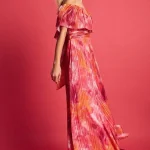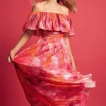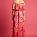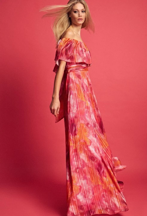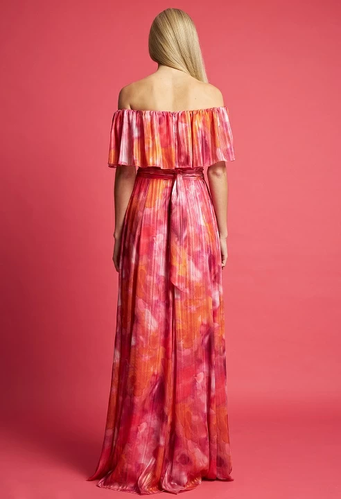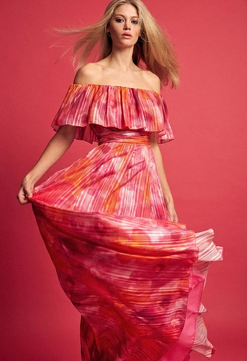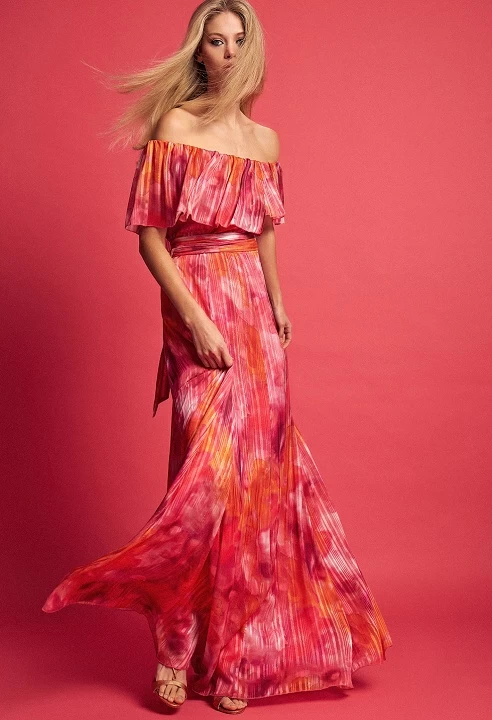 Μακρύ φόρεμα με ανοιχτούς ώμους και βολάν, ζώνη στη μέση από το ίδιο ύφασμα, φόδρα εσωτερικά, κλείσιμο με φερμουάρ στο πίσω μέρος, κανονική εφαρμογή.