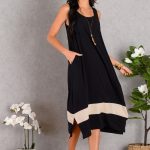 Υπέροχο αέρινο φόρεμα αμάνικο με κολιέ. Στο τελείωμα έχει σχέδιο με εντυπωσιακή τρέσα δημιουργώντας μια αντίθεση, και στο πλάι έχει ανοίγματα. Είναι σε γραμμή “Α” και κατασκευασμένο από ποιοτικό ύφασμα, με δροσερή αίσθηση και ελευθερία κινήσεων. Ιδανική επιλογή στις ζεστές μέρες για τις καθημερινές σας βόλτες ή στις βραδινές σας εξόδους.