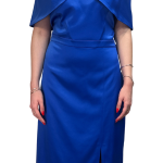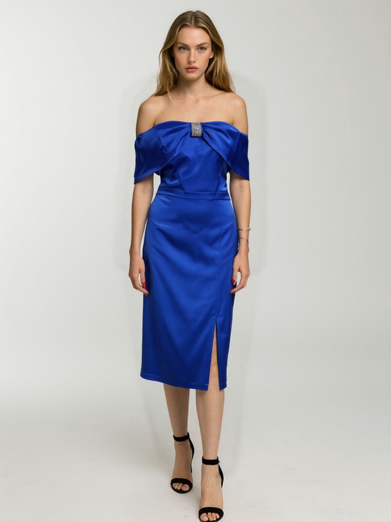 Κομψό midi φόρεμα σε ρουά απόχρωση, με off-shoulder σχέδιο, διακοσμητικό φιόγκο στο μπούστο και λαμπερή αγκράφα. Διαθέτει σκίσιμο στο μπροστινό μέρος για μια σικάτη και θηλυκή εμφάνιση.