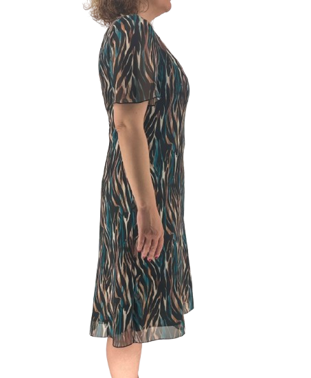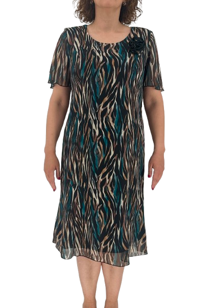 Κομψό midi φόρεμα με εμπριμέ μοτίβο σε γήινες αποχρώσεις και διακριτική διαφάνεια. Διαθέτει κοντό μανίκι, στρογγυλή λαιμόκοψη και διακοσμητικό λουλούδι στον ώμο που χαρίζει θηλυκή και ρομαντική νότα. Το ελαφρύ ύφασμα και η εσωτερική επένδυση προσφέρουν άνεση και ευκολία στην κίνηση, ιδανικό για ιδιαίτερες εμφανίσεις.