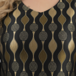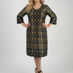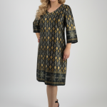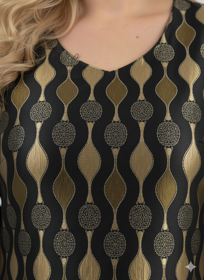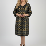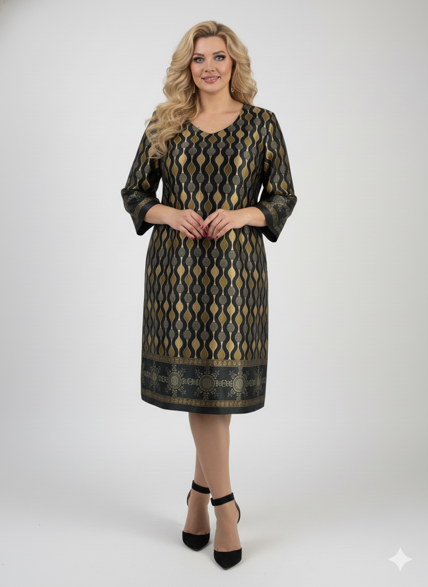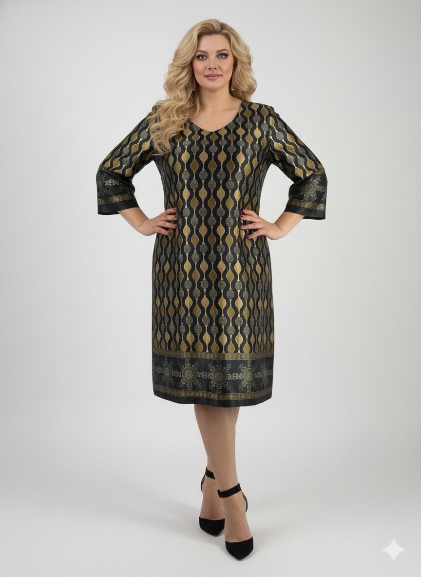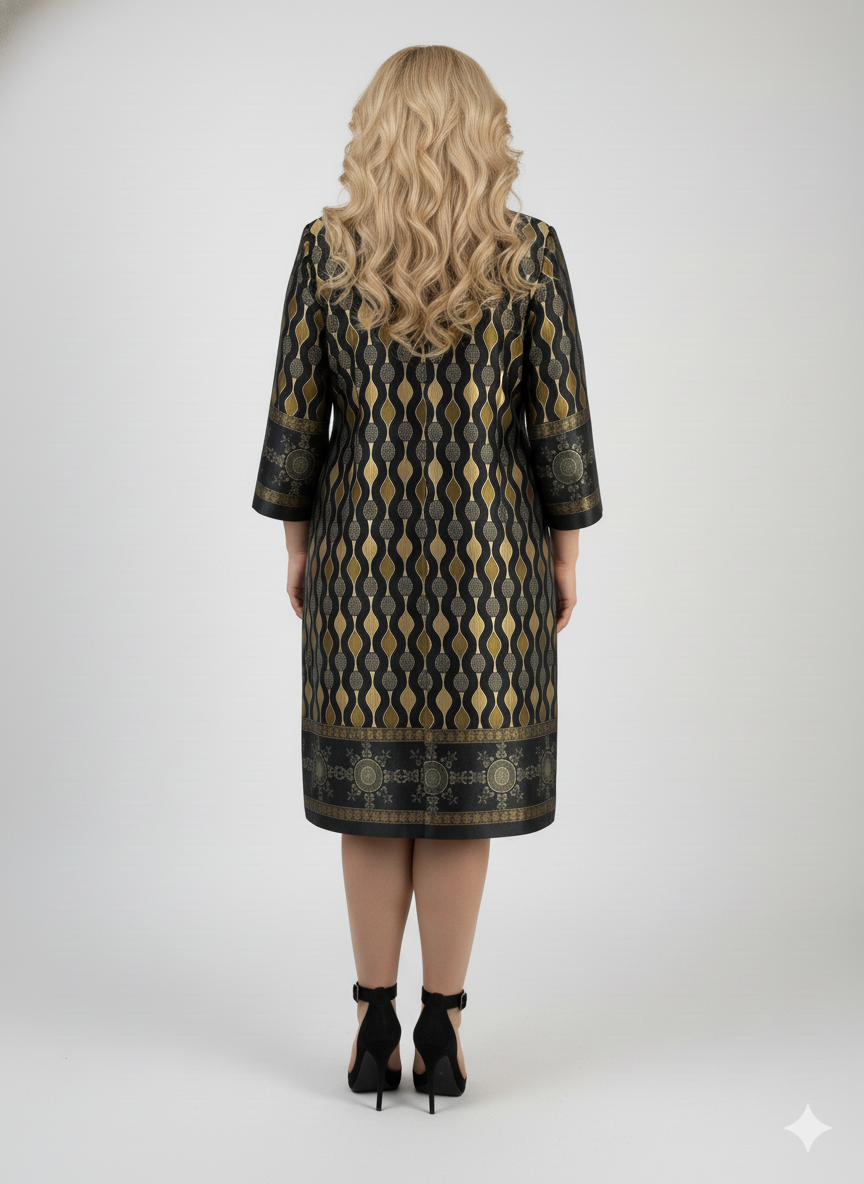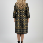 Κομψό φόρεμα σε μαύρο χρώμα με γεωμετρικά σχέδια σε χρυσό και πράσινο