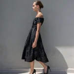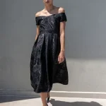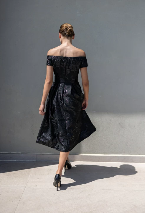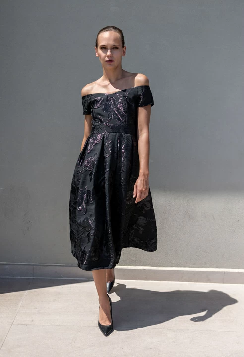 Μίντι φόρεμα μπροκαρ με κοντό μανίκι, ντεκολτέ σε σχήμα καρδιάς, φόδρα εσωτερικά, λεπτομέρεια με πιέτες στη φούστα, κλείσιμο με φερμουάρ στο πίσω μέρος, κανονική εφαρμογή.