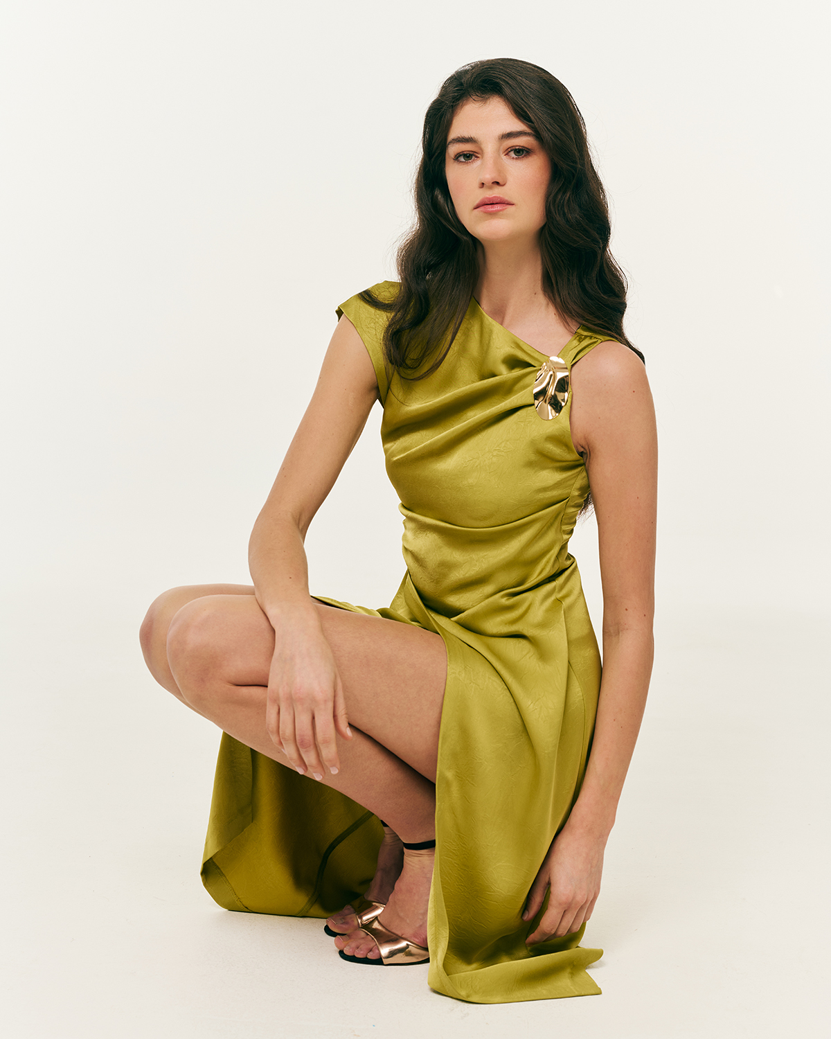 Φόρεμα satin με ντραπέ στη μέση και στον ώμο με χρυσό μεγάλο στοιχείο. Πιο μακρύ μανίκι από την άλλη πλευρά. Κλείσιμο στη πλάτη με κρυφό φερμουάρ.
