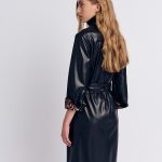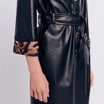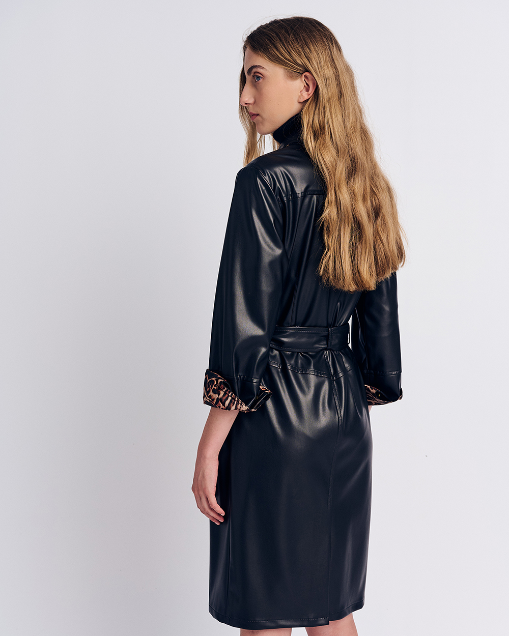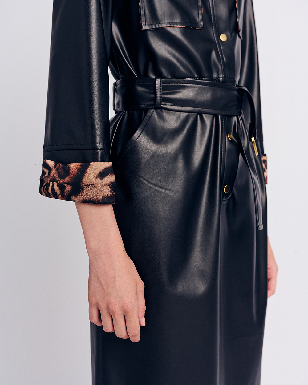 Φόρεμα σεμιζιέ δερματίνη. Κλασικός γιακάς και τσέπες τετράγωνες. Λεπτομέρεια, ζώνη από το ίδιο ύφασμα και animal φόδρα στις μανσέτες, στον γιακά και στις τσέπες. Κλείσιμο στο μπροστινό μέρος με κουμπιά.