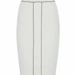 Φούστα pencil σε κρεπ ύφασμα. Διχρωμία με μαύρο ρέλι. Λεπτομέρεια, άνοιγμα μπροστά. Κλείσιμο με φερμουάρ στο πίσω μέρος.