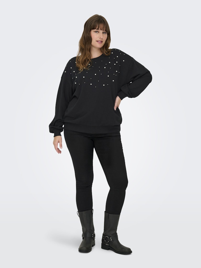 Μαύρο φούτερ που συνδυάζει την άνεση με την κομψότητα, διακοσμημένο με πέρλες και μικρά μεταλλικά στοιχεία στο πάνω μέρος.