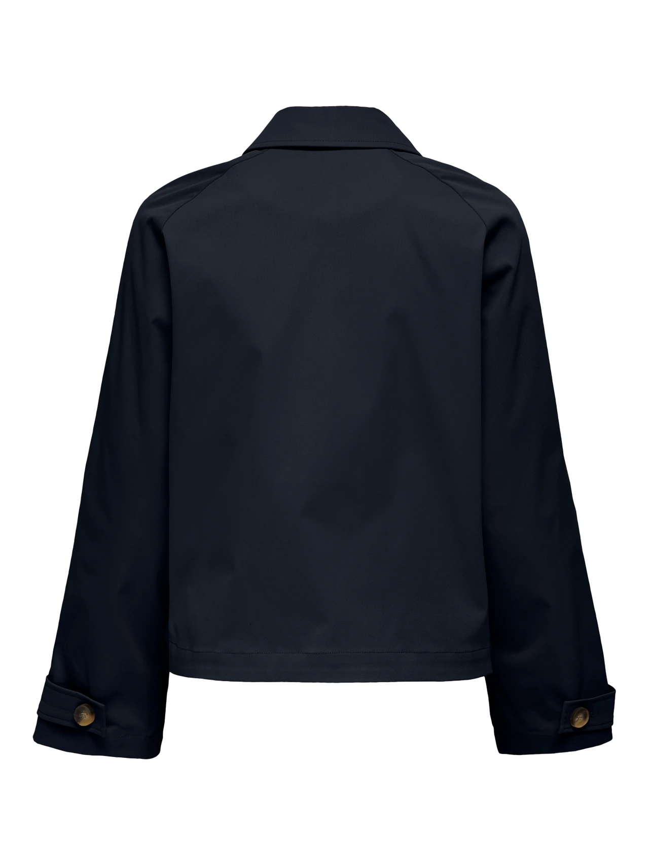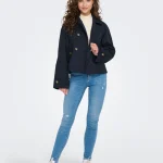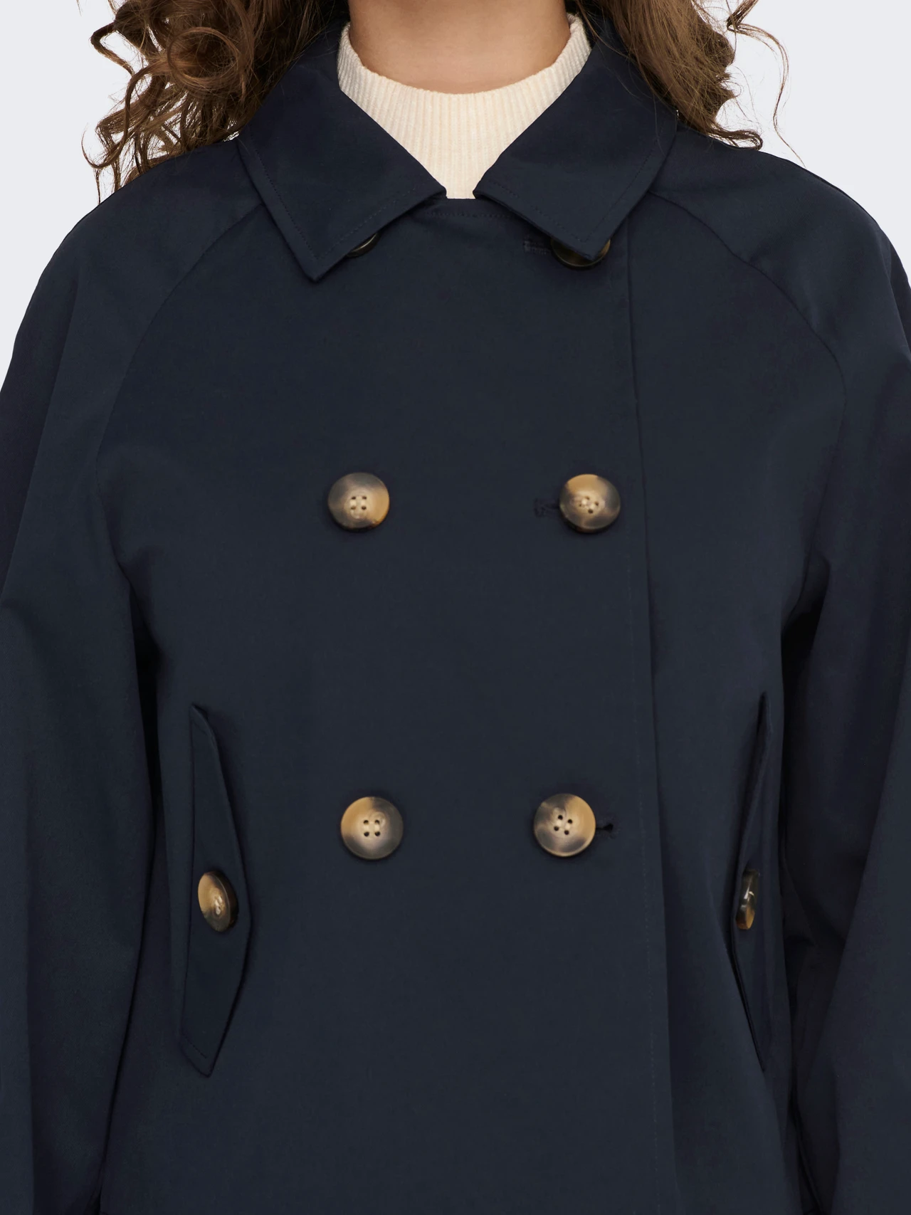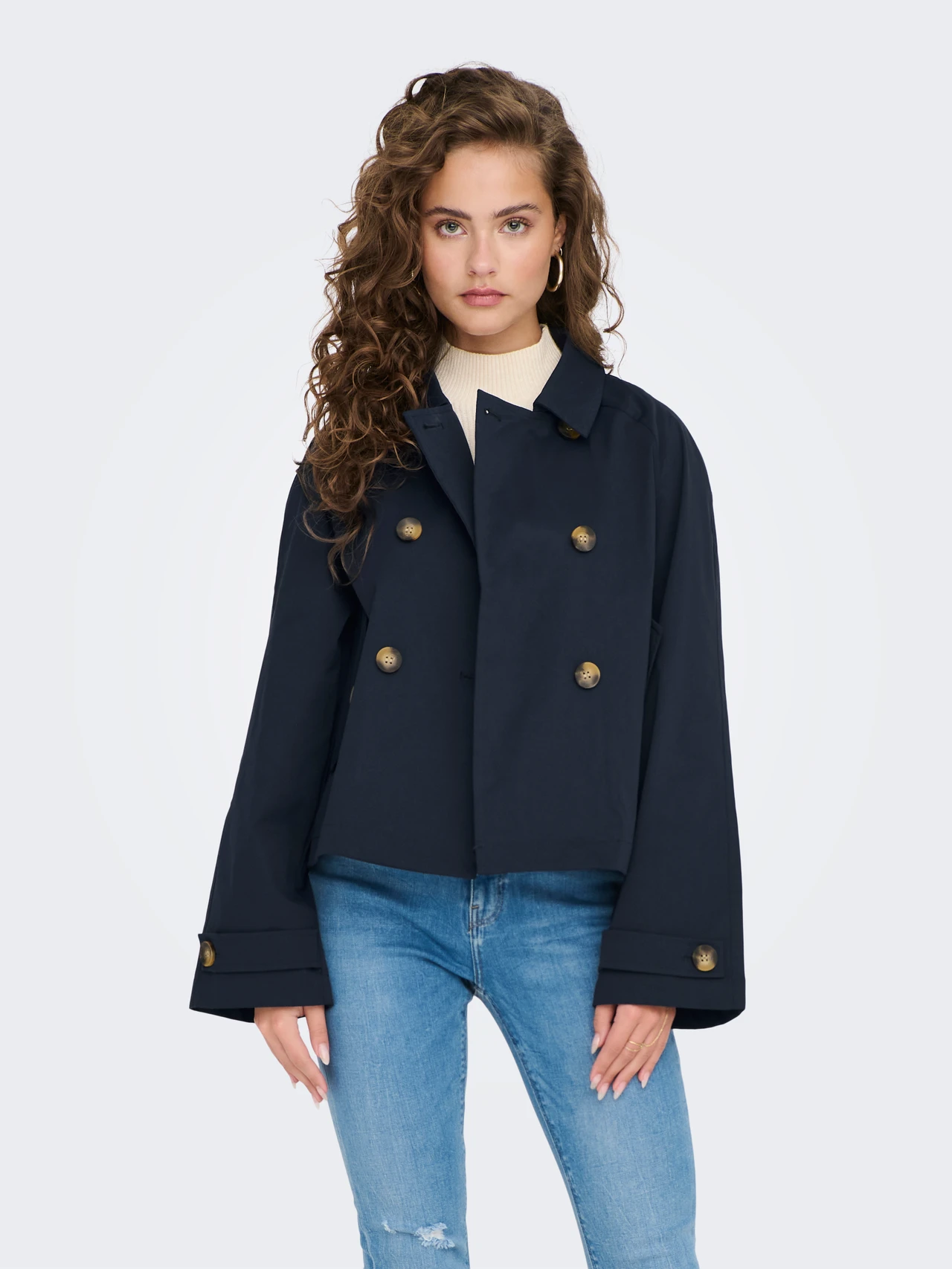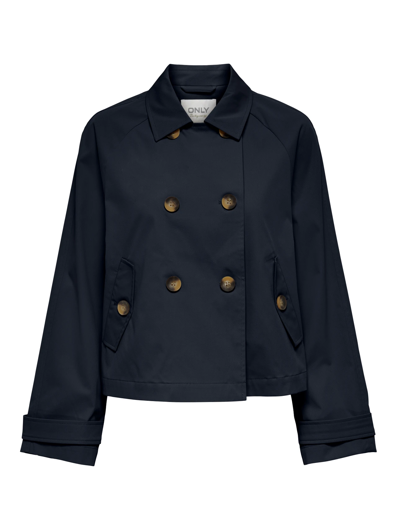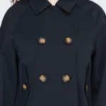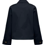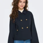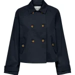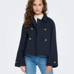 ONLY Διαχρονική καμπαρντίνα κοντή μπλέ με σταυρωτό κούμπωμα . Έχει τσέπες με κουμπιά στο πλάι. Zωνάκι στα μανίκια.