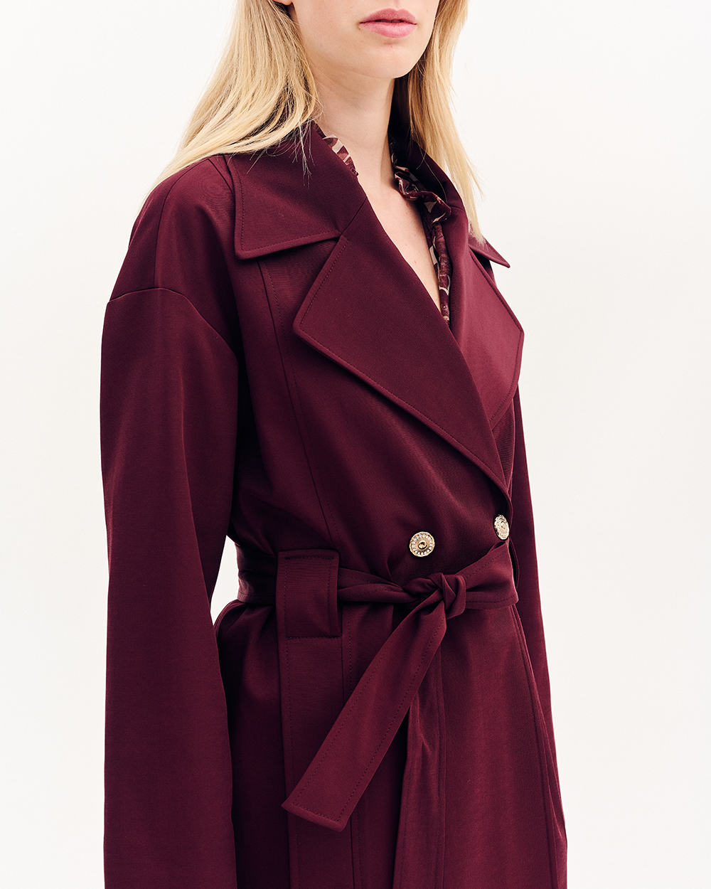 Καπαρντίνα μακριά με μείγμα από βαμβακερό ύφασμα. Γιακάς με πέτο, ζώνη, τσέπες φιλέτο μπροστά και μία εσωτερική.
