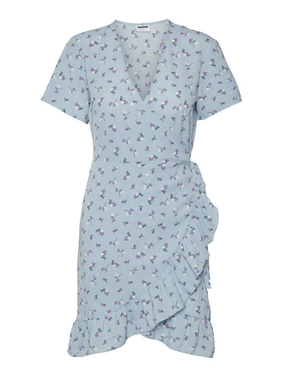 Κοντό φόρεμα με λαιμόκοψη – V λαιμόκοψη – Κοντό μανίκι – Κρυφό κούμπωμα στο μπροστινό μέρος – Ρυθμιζόμενο κορδόνι στη μέση – Στρίφωμα βολάν – Ελαφρύ, μη ελαστικό ύφασμα – Κανονική εφαρμογή