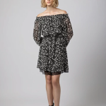 Φόρεμα με ίσιο ντεκολτέ ελαστικό, μακρύ μανίκι που καταλήγει σε ελαστική μανσέτα και βολάν, ελαστική μέση με ασορτί ζώνη, λεπτομέρεια με δαντέλα στο τελείωμα, φόδρα εσωτερικά, κανονική εφαρμογή.