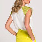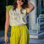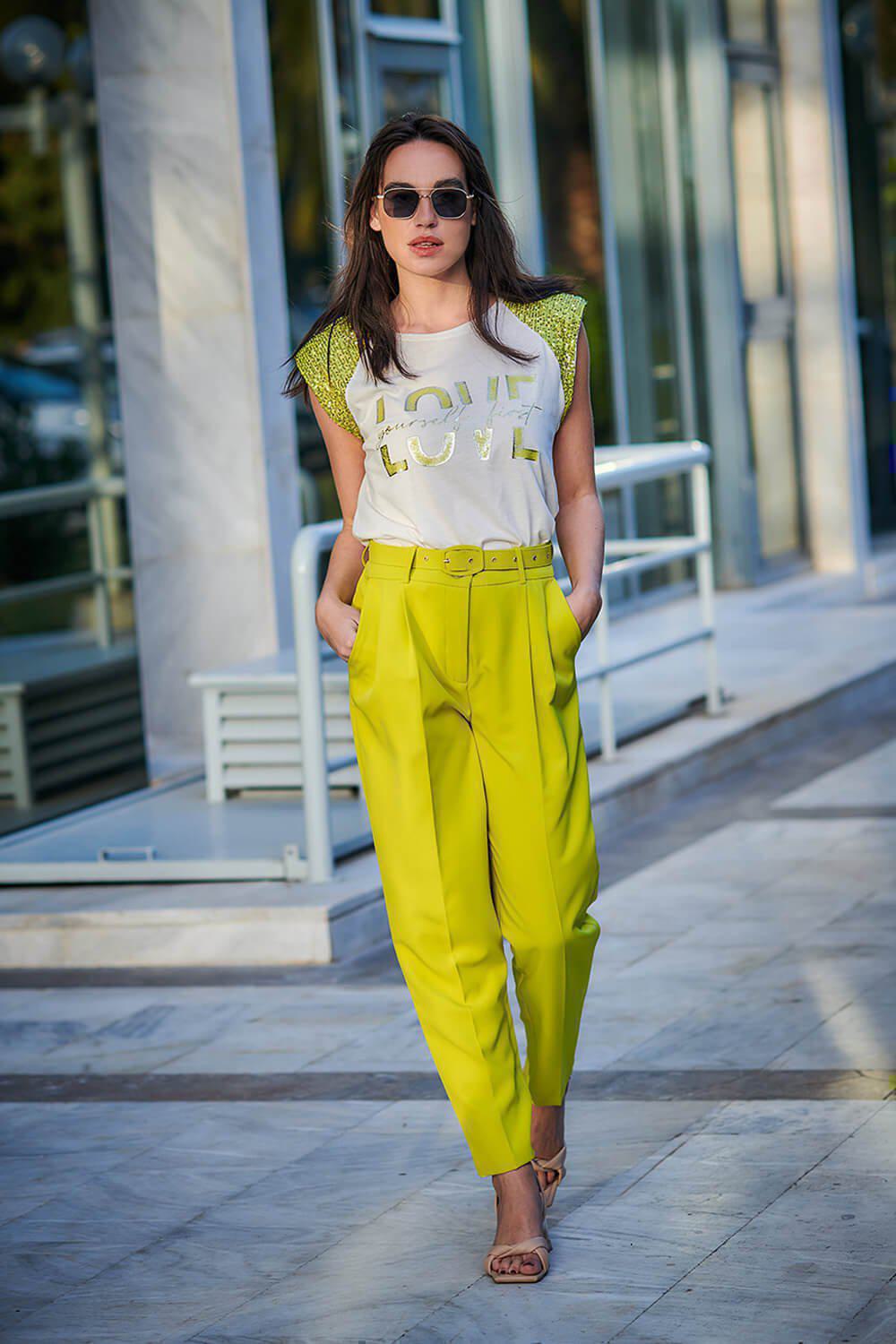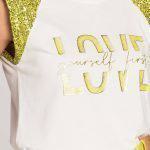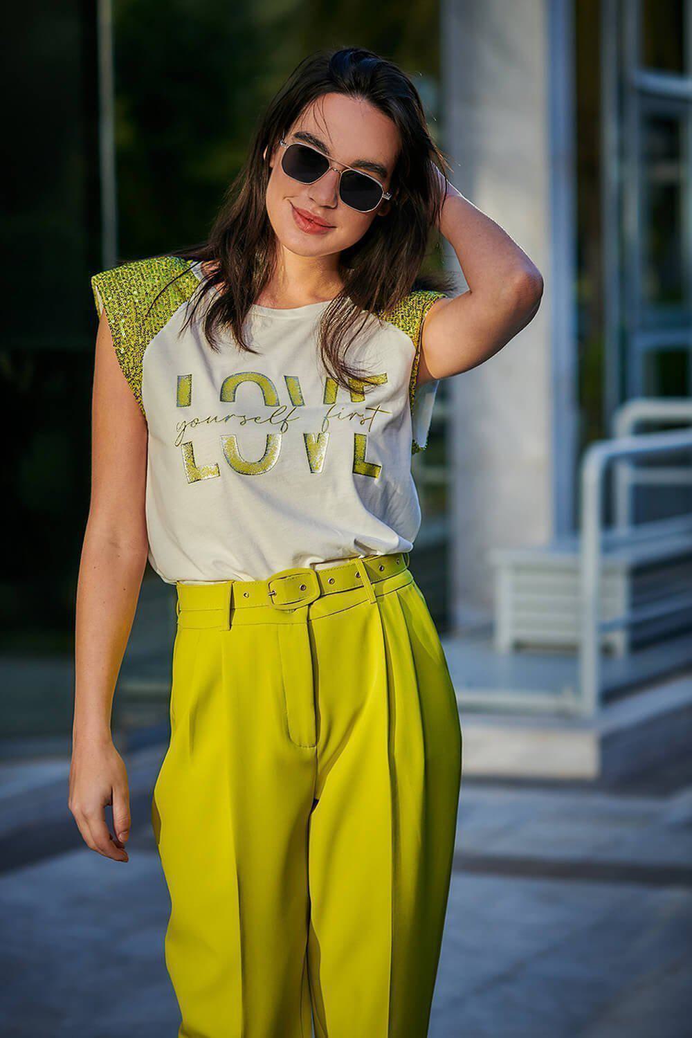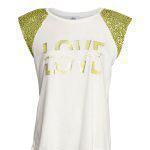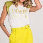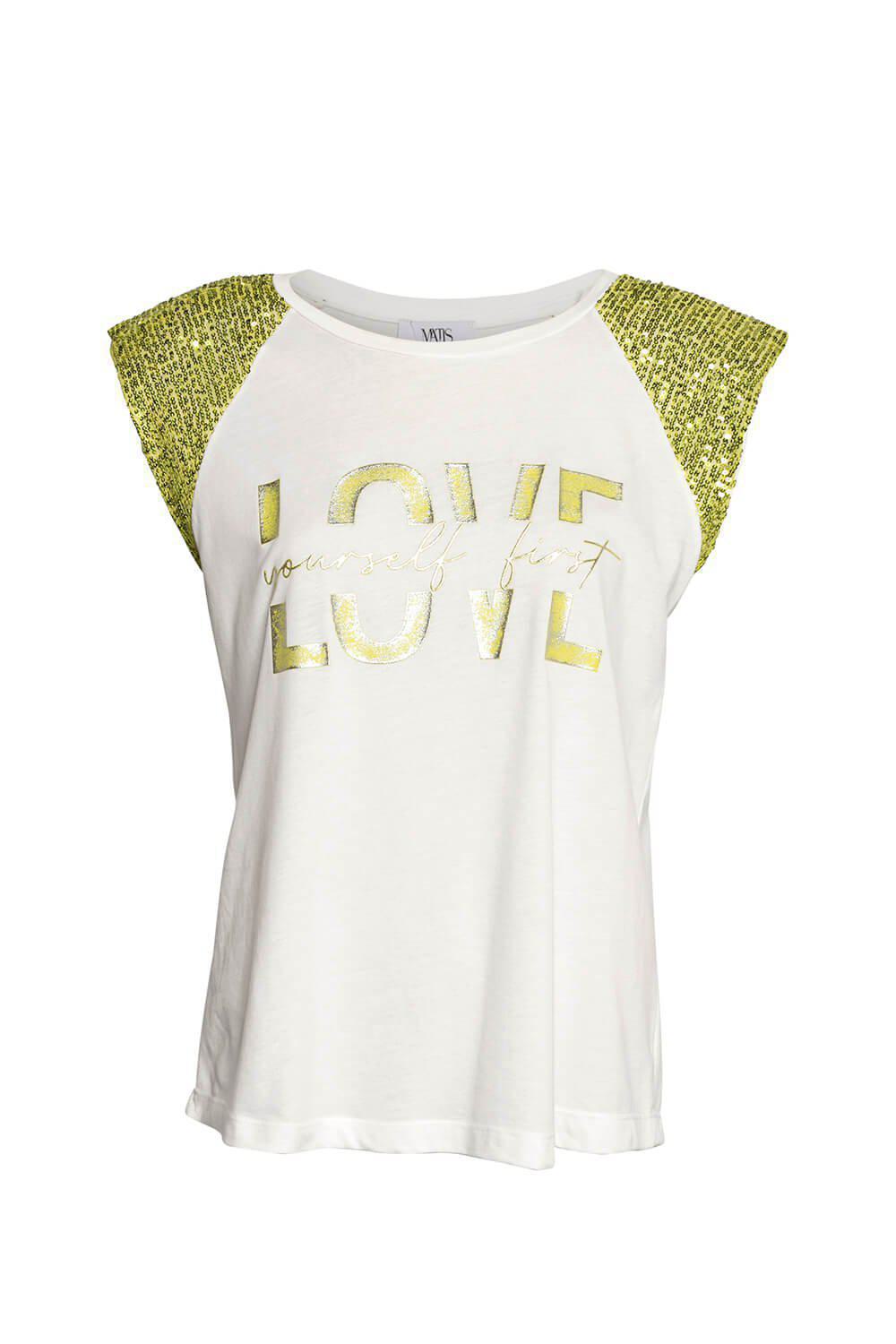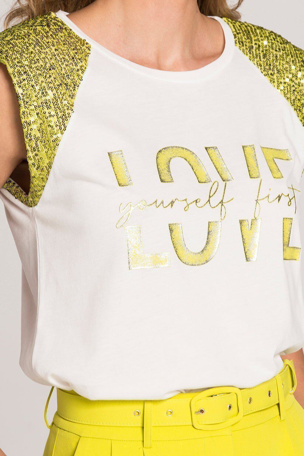 Κοντομάνικη μπλούζα με παγιέτα, βάτες στους ώμους, τύπωμα μπροστά