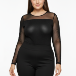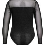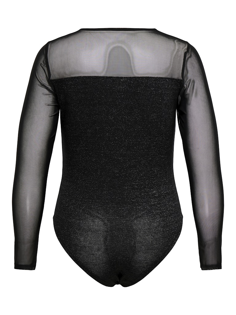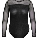 Plus Size Γυναικείο κορμάκι σε μαύρο χρώμα με μακριά μανίκια και διαφάνειες. Διαθέτει λάμψη στο ύφασμα και εσωτερική επένδυση . Ιδανικό για βραδινές εξόδους και εντυπωσιακά looks.