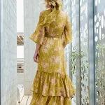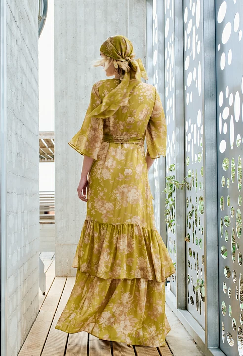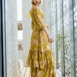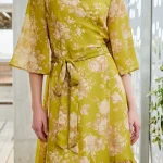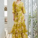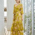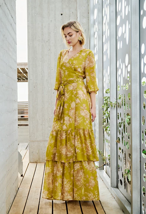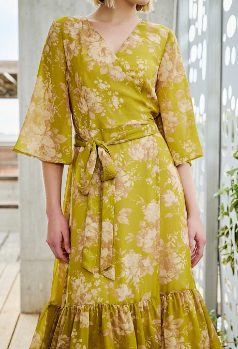 Εμπριμέ φόρεμα κρουαζέ με V ντεκολτέ, μανίκι κάτω από τον αγκώνα, σταυρωτό κλείσιμο με ζώνη, διπλό βολάν στο τελείωμα, κανονική εφαρμογή.