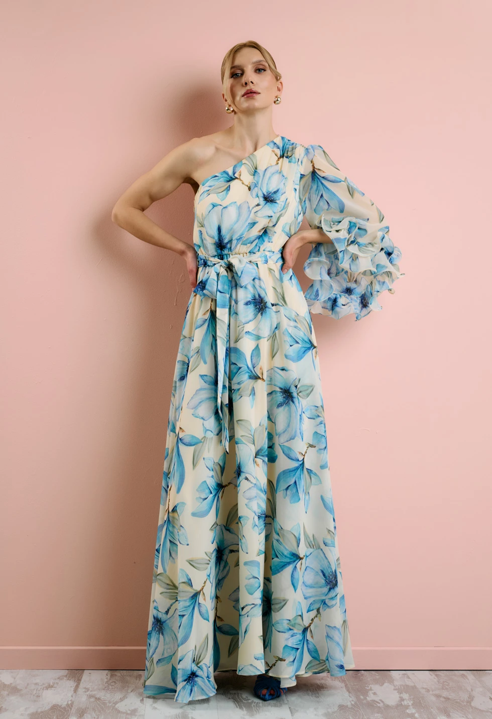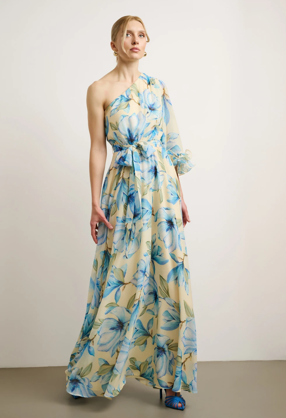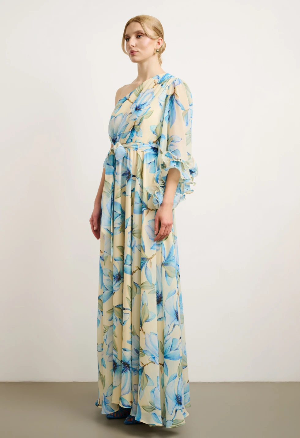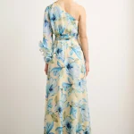 Εντυπωσιακό μάξι φόρεμα με ρομαντικό φλοράλ print σε απαλό κίτρινο φόντο και γαλάζιες αποχρώσεις. Ο ασύμμετρος σχεδιασμός με έναν ώμο και το αέρινο μανίκι με βολάν δημιουργούν ένα κομψό και θηλυκό αποτέλεσμα, ιδανικό για ξεχωριστές εμφανίσεις. Διαθέτει εσωτερική φόδρα για άνεση και σωστή εφαρμογή, ενώ κλείνει με φερμουάρ στο πλάι για διακριτικό και σταθερό κούμπωμα. Η αποσπώμενη ζώνη τονίζει τη μέση και αναδεικνύει τη σιλουέτα, χαρίζοντας αρμονική γραμμή και κομψή κίνηση. Ιδανική επιλογή για γάμο, βάπτιση, επίσημη εκδήλωση ή καλοκαιρινό event.