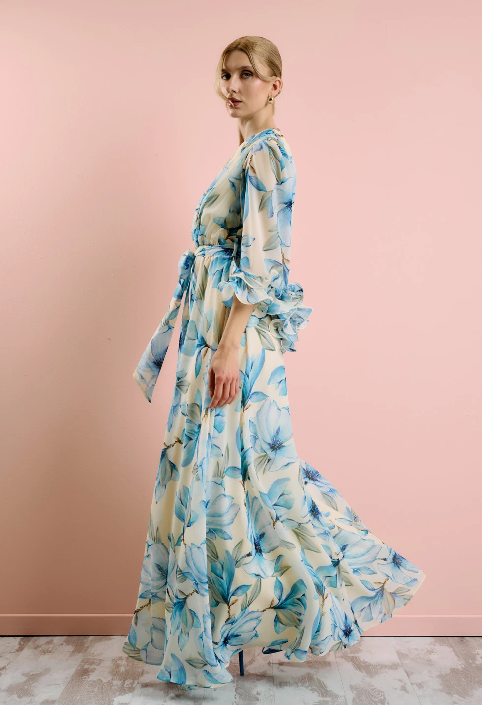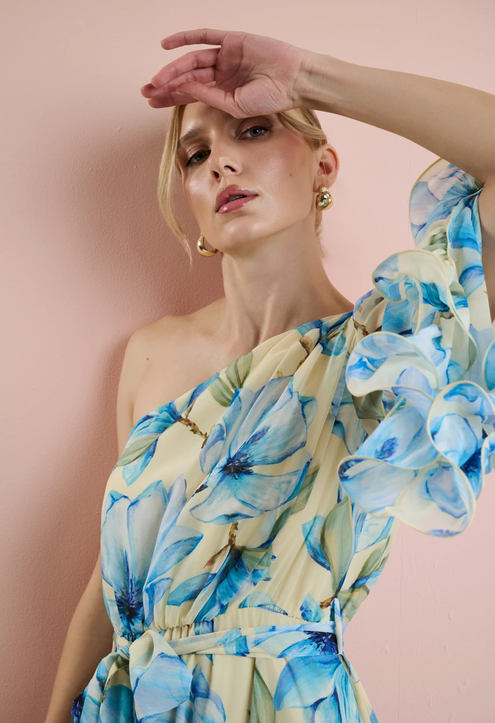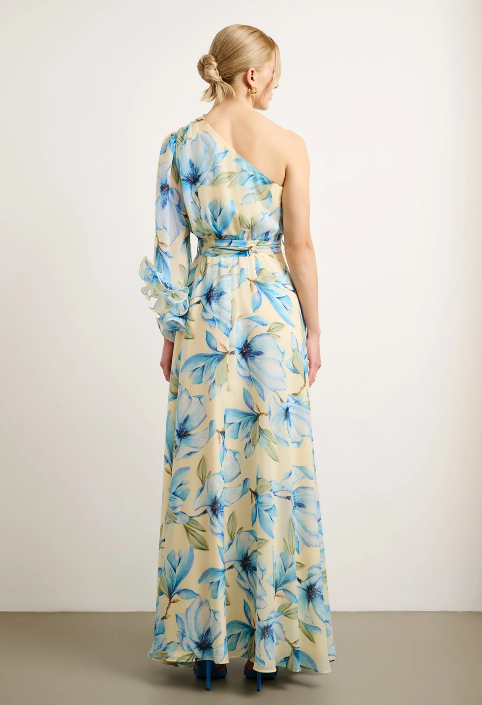 Εντυπωσιακό μάξι φόρεμα με ρομαντικό φλοράλ print σε απαλό κίτρινο φόντο και γαλάζιες αποχρώσεις. Ο ασύμμετρος σχεδιασμός με έναν ώμο και το αέρινο μανίκι με βολάν δημιουργούν ένα κομψό και θηλυκό αποτέλεσμα, ιδανικό για ξεχωριστές εμφανίσεις. Διαθέτει εσωτερική φόδρα για άνεση και σωστή εφαρμογή, ενώ κλείνει με φερμουάρ στο πλάι για διακριτικό και σταθερό κούμπωμα. Η αποσπώμενη ζώνη τονίζει τη μέση και αναδεικνύει τη σιλουέτα, χαρίζοντας αρμονική γραμμή και κομψή κίνηση. Ιδανική επιλογή για γάμο, βάπτιση, επίσημη εκδήλωση ή καλοκαιρινό event.