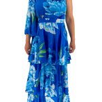 Εντυπωσιακό μάξι φόρεμα με έναν ώμο και βολάν, σε έντονο φλοράλ σχέδιο. Κομψή επιλογή για ιδιαίτερες περιστάσεις.