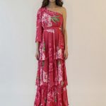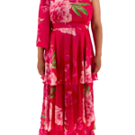 Εντυπωσιακό μάξι φόρεμα με έναν ώμο και βολάν, σε έντονο φλοράλ σχέδιο. Κομψή επιλογή για ιδιαίτερες περιστάσεις.