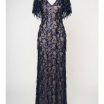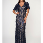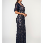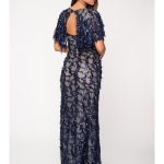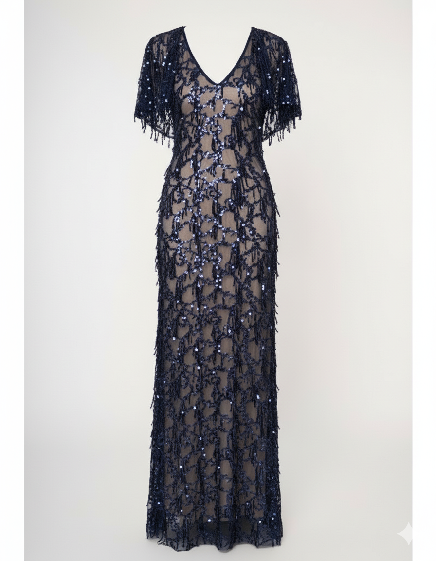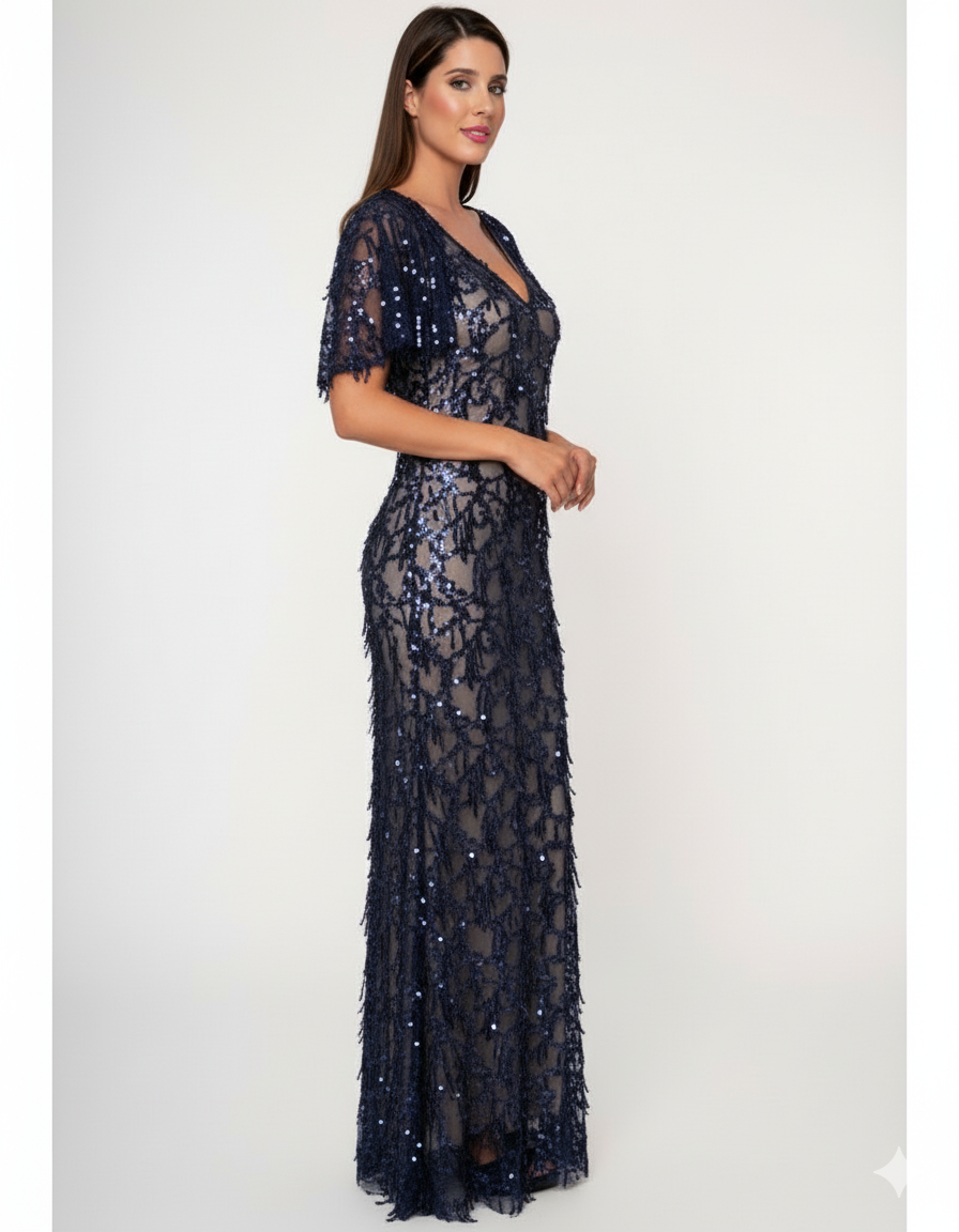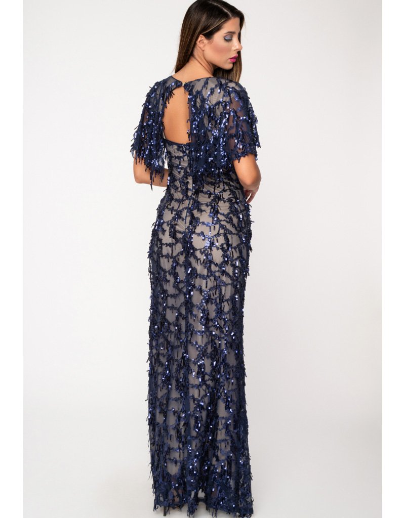 Κομψό μάξι φόρεμα σε διαφάνεια, με nude βάση, περίτεχνη διακόσμηση από μπλε σκούρες παγιέτες, Διαθέτει V-ντεκολτέ, μανίκια που αγκαλιάζουν τους ώμους προσφέροντας αέρα πολυτέλειας