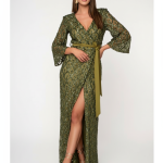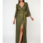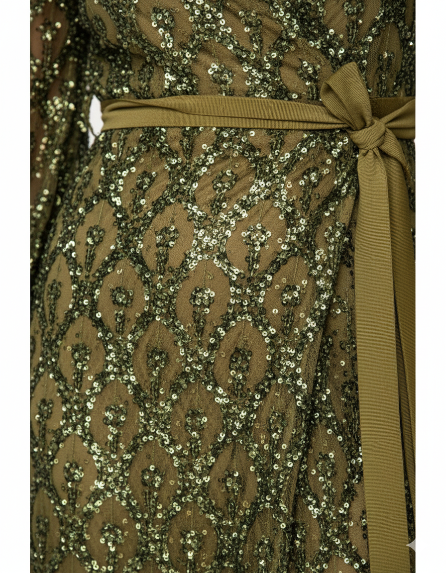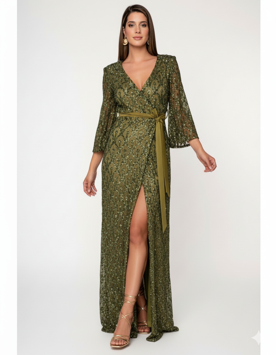Εντυπωσιακό μάξι φόρεμα σε olive απόχρωση, διακοσμημένο με παγιέτες σε διακριτικό μοτίβο. Διαθέτει βαθύ V ντεκολτέ, ζώνη στη μέση για έμφαση στη σιλουέτα και σκίσιμο στο μπροστινό μέρος που χαρίζει θηλυκότητα και κίνηση. Ιδανικό για βραδινές εμφανίσεις και ιδιαίτερες περιστάσεις.