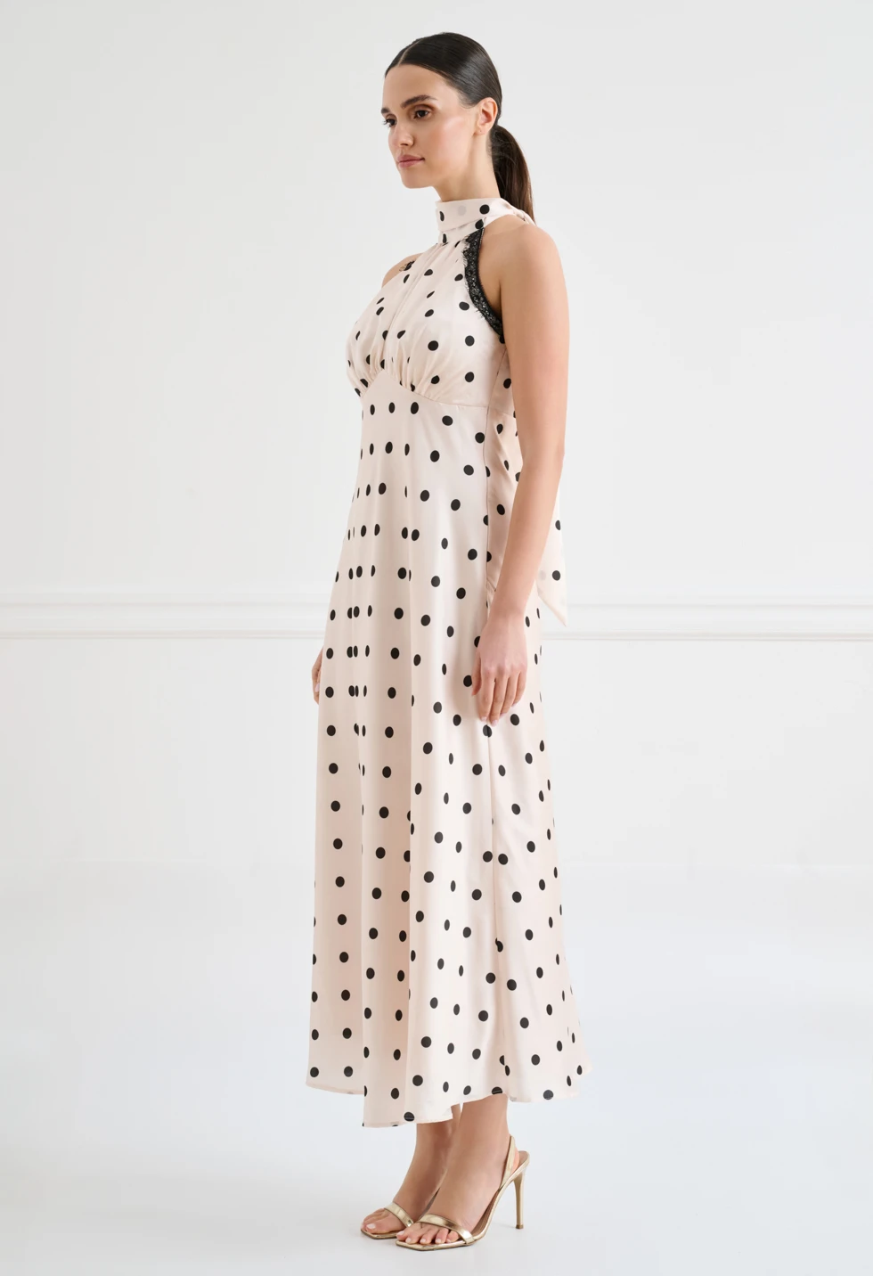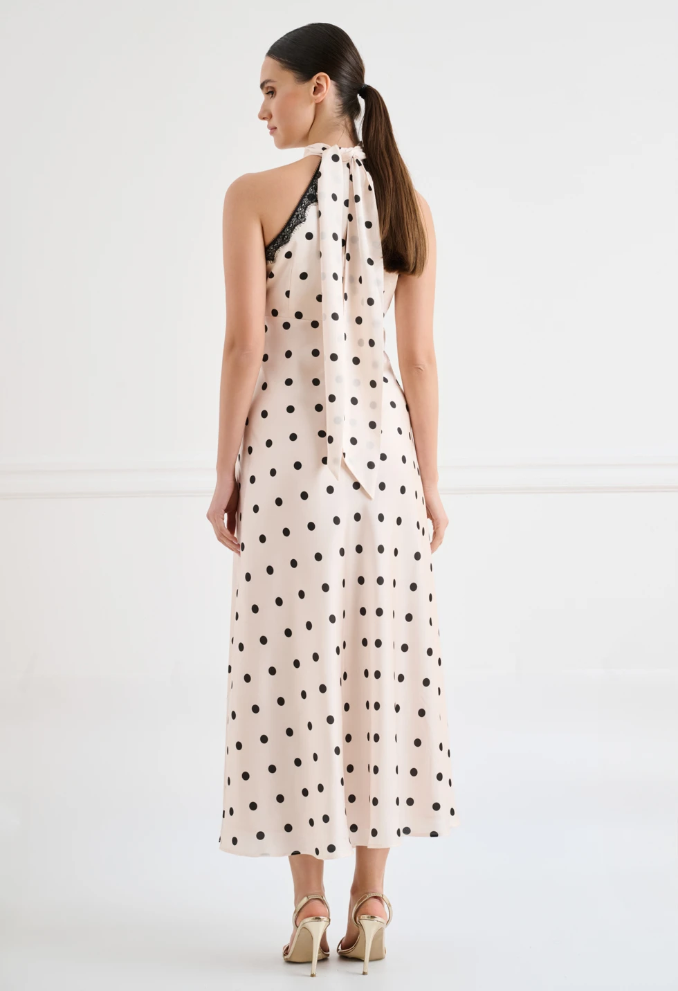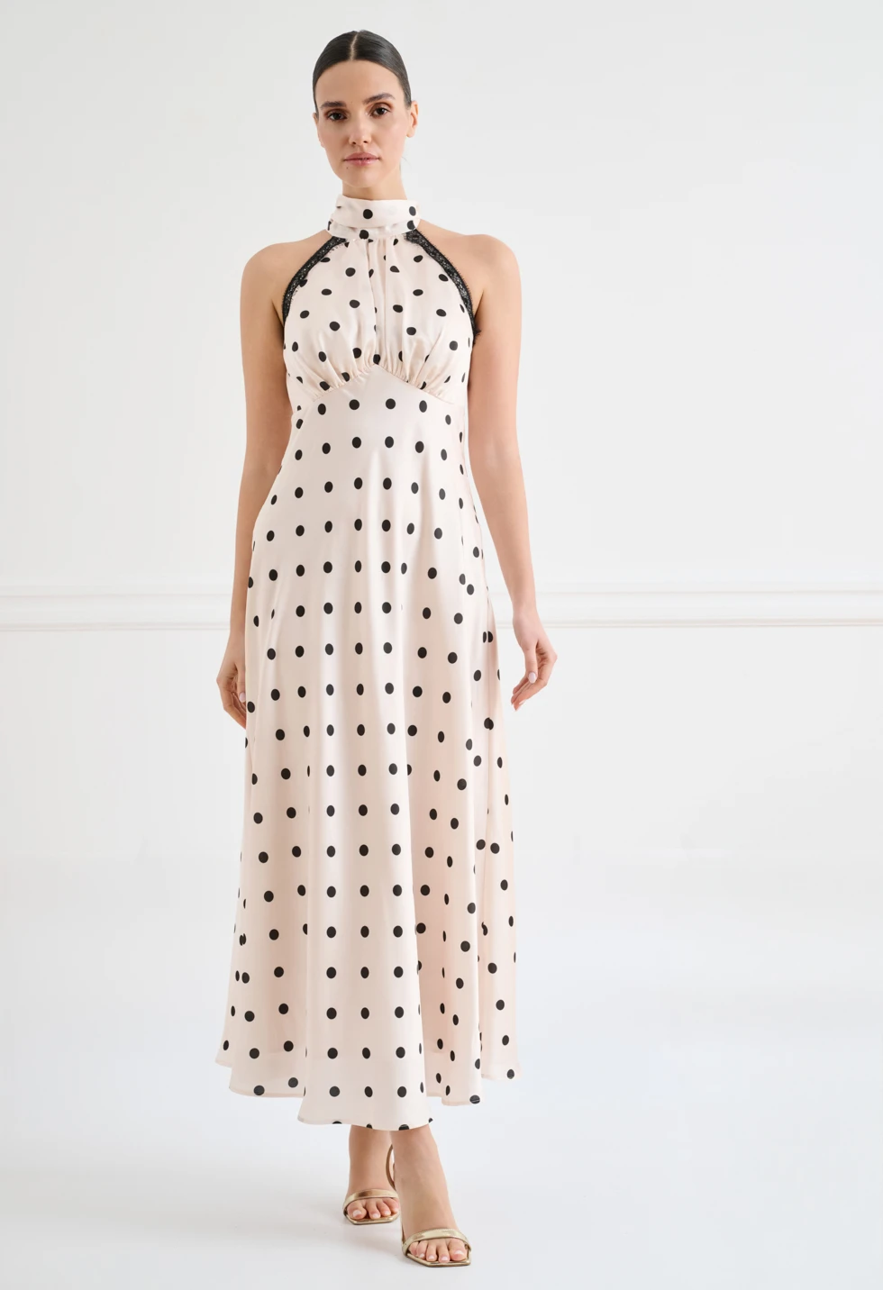 Maxi πουά φόρεμα σε off-white απόχρωση με halter λαιμόκοψη και ψηλό γιακά, μαύρη δαντέλα στο μπούστο και αέρινη γραμμή. Διαθέτει εσωτερική φόδρα, σούρα στη μέση για άνετη εφαρμογή και κλείσιμο με φερμουάρ πίσω, ενώ ολοκληρώνεται με εντυπωσιακό δέσιμο/φιόγκο στην πλάτη. Ιδανικό για γάμο, βάπτιση, cocktail και καλοκαιρινές βραδινές εμφανίσεις.