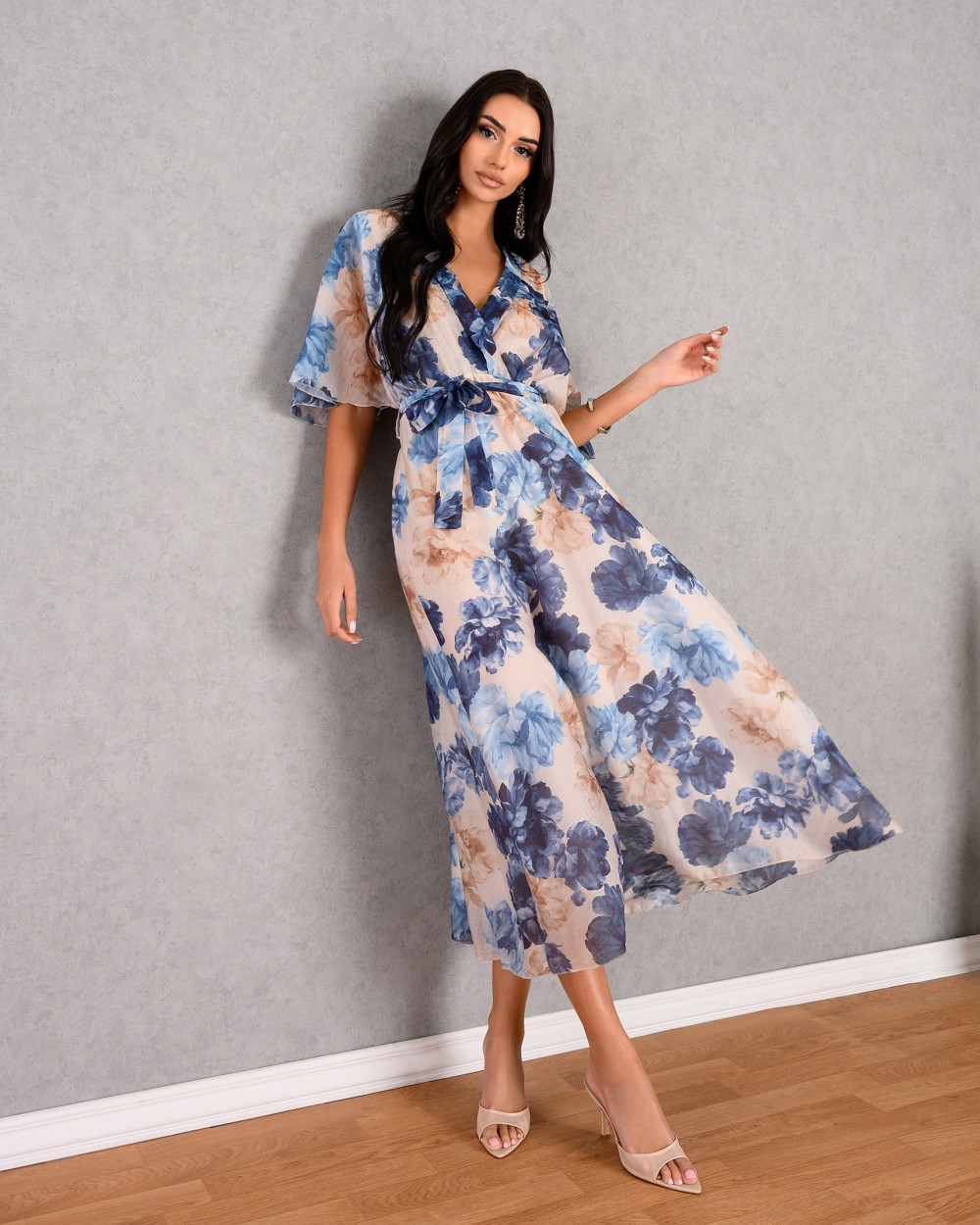 Ρομαντικό μάξι φόρεμα σε απαλές αποχρώσεις του μπλε και του μπεζ, με εντυπωσιακό floral μοτίβο. Διαθέτει κρουαζέ ντεκολτέ που κολακεύει το μπούστο, φαρδιά μανίκια και ελαστική μέση που αναδεικνύεται με αφαιρούμενη ζώνη από το ίδιο ύφασμα. Η αέρινη γραμμή του το καθιστά ιδανική επιλογή για καλοκαιρινές εκδηλώσεις ή βραδινές εξόδους.