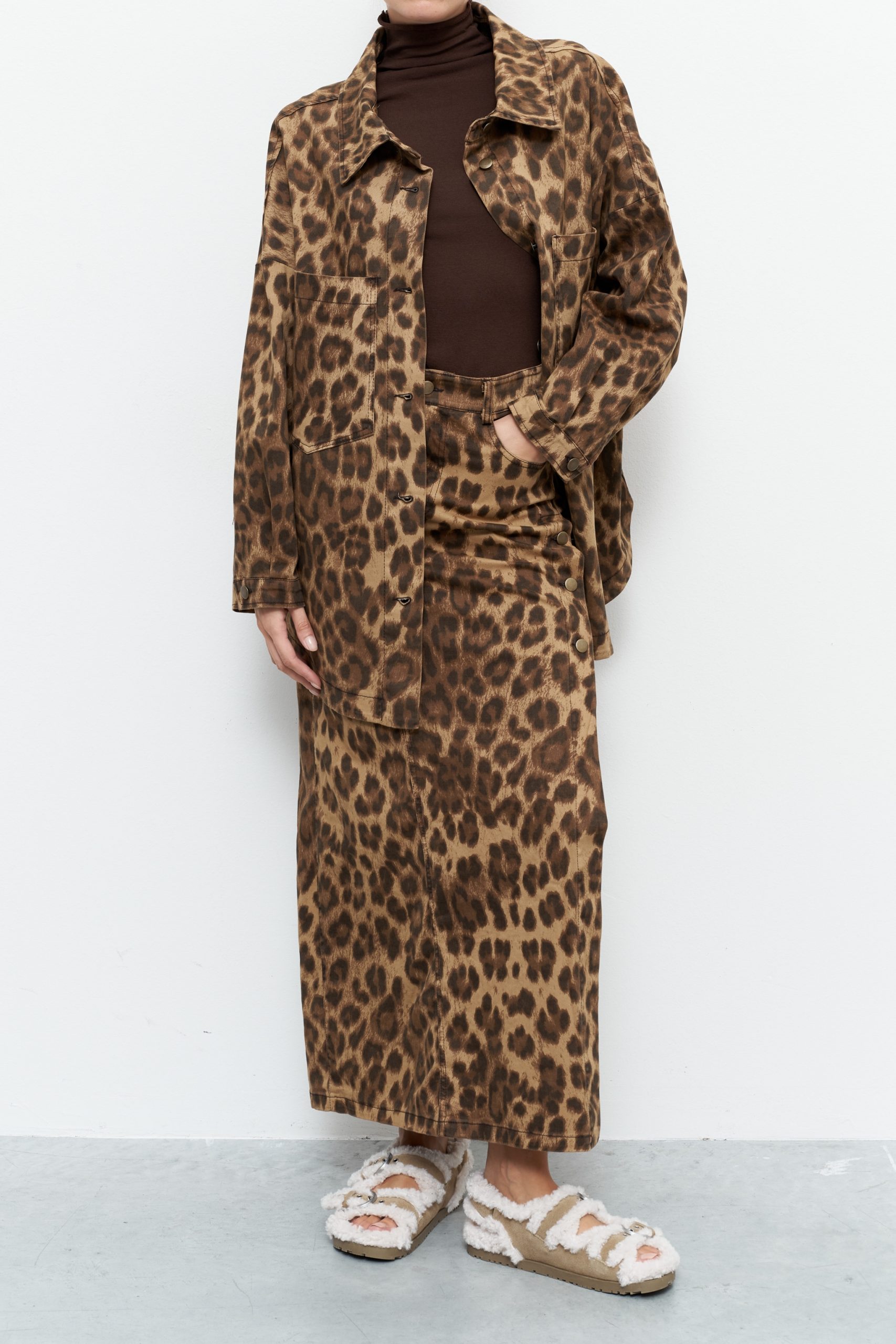 Maxi τζιν φούστα με animal print, ψηλόμεσο, σκίσιμο στο πλάι και μεταλλικά κουμπιά.Κλείσιμο με φερμουάρ. Κανονική εφαρμογή