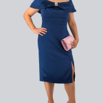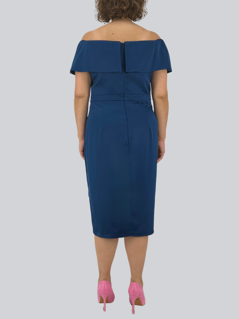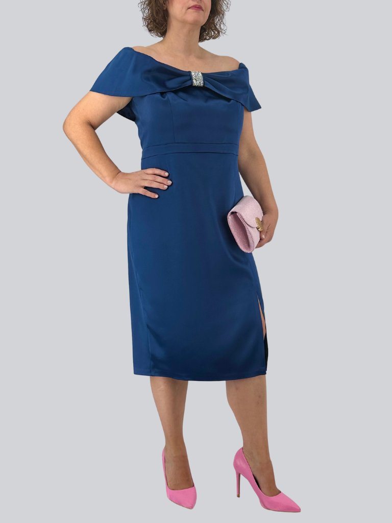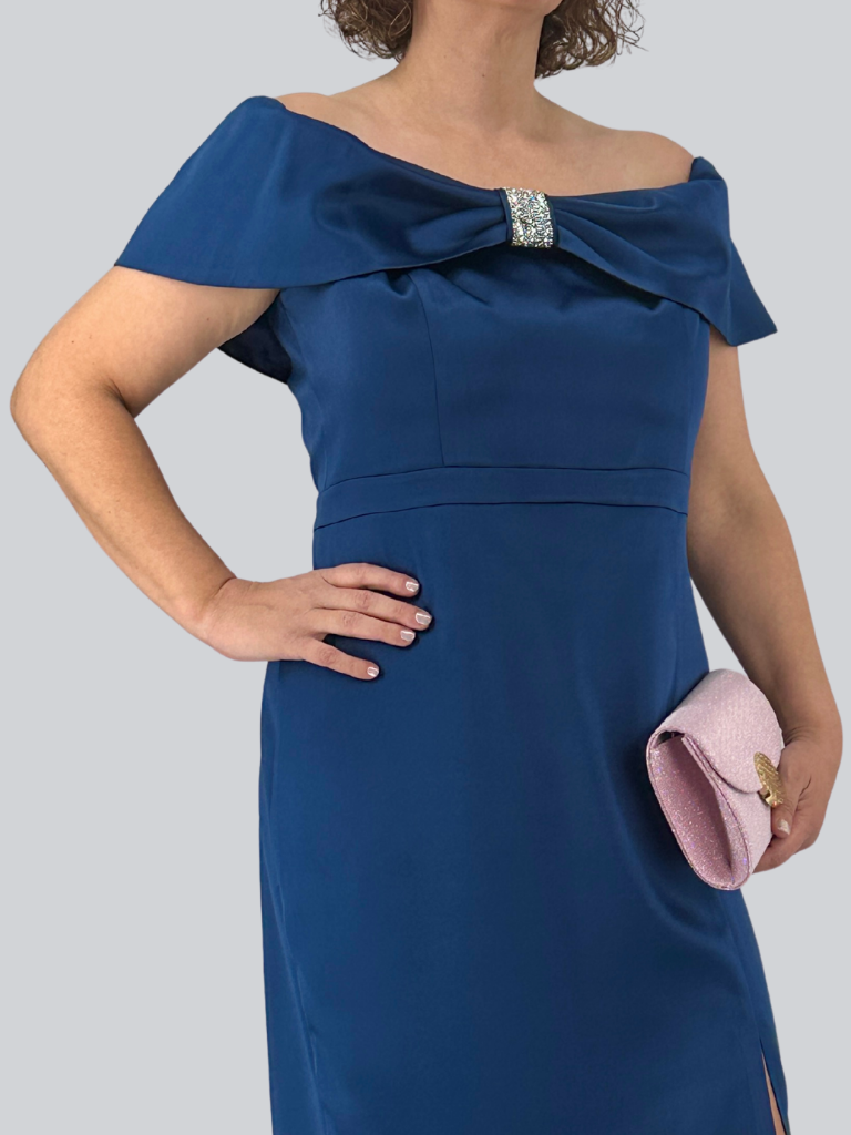 Κομψό midi φόρεμα με έξω τους ώμους και εντυπωσιακή λεπτομέρεια με στρας στο μπούστο. Στενή γραμμή που κολακεύει τη σιλουέτα και διακριτικό σκίσιμο στο πλάι για μια πιο θηλυκή εμφάνιση. Ιδανικό για ιδιαίτερες περιστάσεις και εκδηλώσεις.