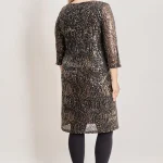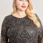 Midi φόρεμα με διακόσμηση παγιέτας. Φοδραρισμένο. Στρογγυλή λαιμόκοψη και μανίκια 3/4. Το μοντέλο έχει ύψος 177εκ, στήθος 105, μέση 88, περιφέρεια 110 και φοράει μέγεθος 1
