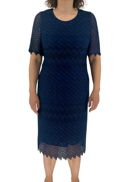 Μίντι φόρεμα δαντέλα σε μπλε απόχρωση, με ζιγκ-ζαγκ μοτίβο, κοντά μανίκια και κυματιστό τελείωμα.