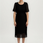 Μίντι φόρεμα δαντέλα σε μαύρη απόχρωση, με ζιγκ-ζαγκ μοτίβο, κοντά μανίκια και κυματιστό τελείωμα.