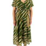 Μίντι φόρεμα σε κρουαζέ γραμμή με κοντά, αέρινα μανίκια και εντυπωσιακό animal print σε αποχρώσεις του λαδί και του μπεζ. Συνοδεύεται από ζώνη στη μέση από ύφασμα σε αντίθεση. Κατάλληλο για κομψές εμφανίσεις με ιδιαίτερο χαρακτήρα.