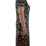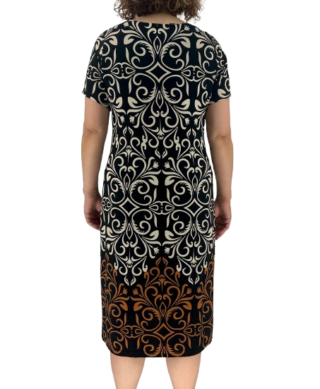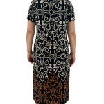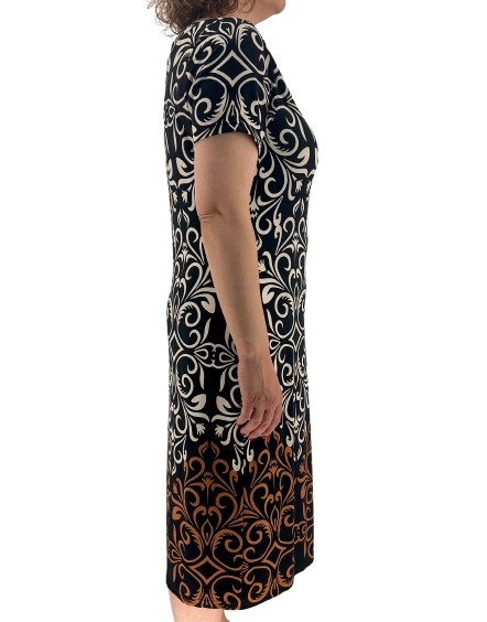 Κομψό μίντι φόρεμα με μοναδικό σχέδιο σε τόνους εκρού, μαύρου και καφέ. Διαθέτει στρογγυλή λαιμόκοψη και κοντά μανίκια για άνετη εφαρμογή. Ιδανική επιλογή για ξεχωριστές εμφανίσεις με στιλ.