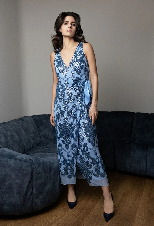 Μίντι φόρεμα αμάνικο με V ντεκολτέ, σχέδιο κρουαζέ με δέσιμο στο πλάι, φόδρα εσωτερικά, κανονική εφαρμογή.