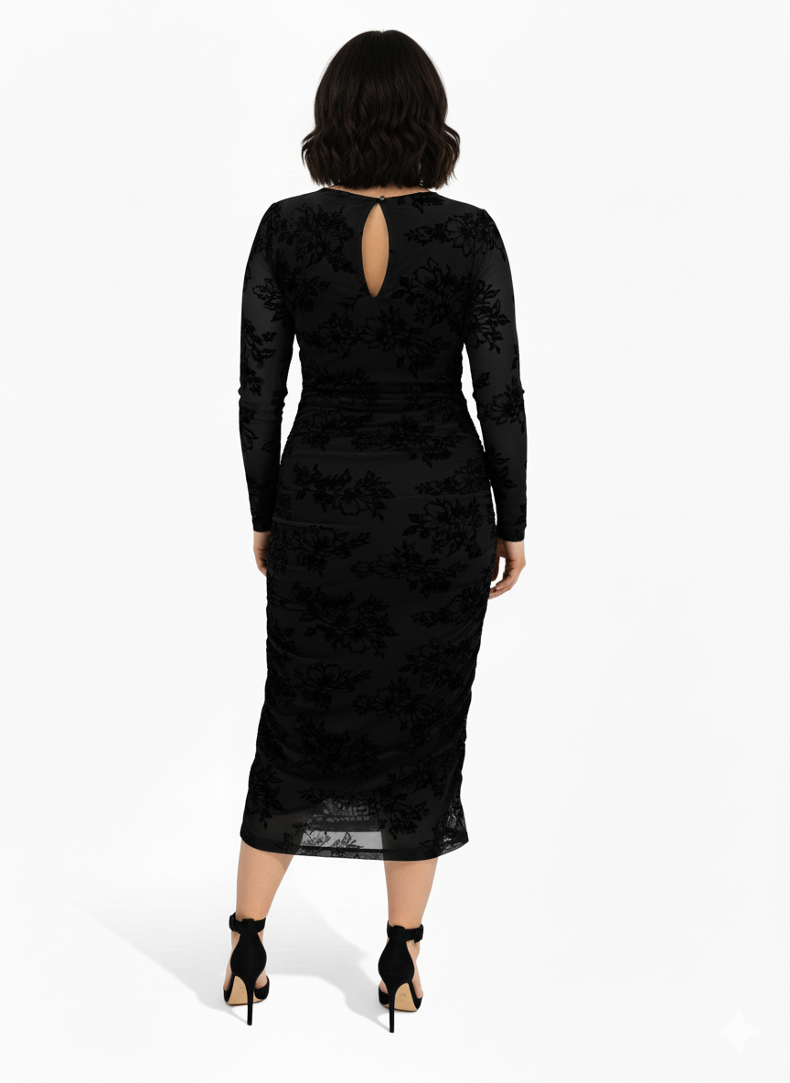 Μίντι φόρεμα με βελούδινα floral σχέδια και σούρες