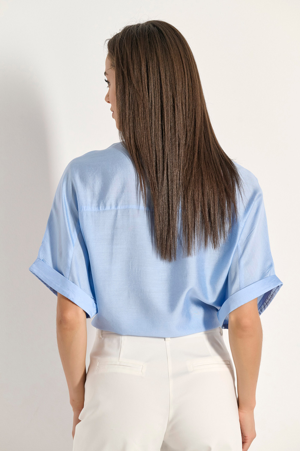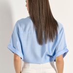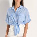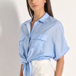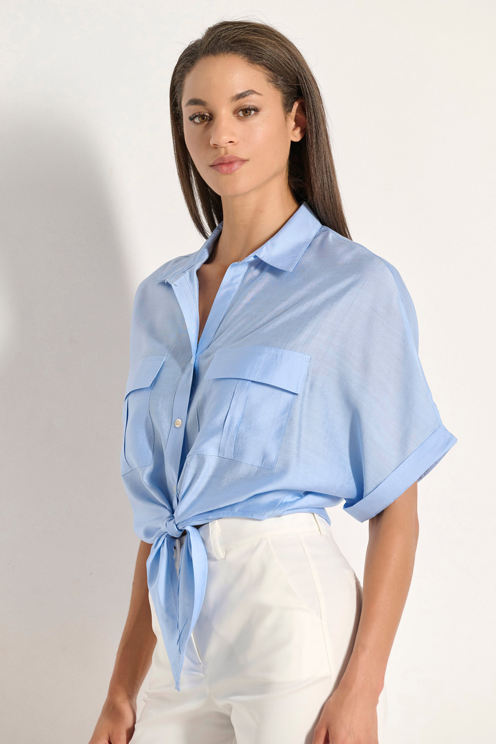 Αέρινο και μοντέρνο πουκάμισο με κοντά μανίκια και γιακά, ιδανικό για καλοκαιρινές εμφανίσεις. Διαθέτει μπροστινές τσέπες με καπάκι στο μπούστο και ιδιαίτερο φινίρισμα μπροστά που καταλήγει σε μυτερές άκρες, δίνοντας τη δυνατότητα να δεθεί. Το σατινέ του ύφασμα χαρίζει κομψότητα και ελαφριά λάμψη, ενώ η σύνθεσή του προσφέρει απαλότητα και διακριτική διαφάνεια.