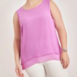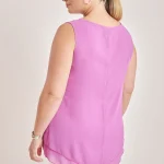 Αμάνικη μπλούζα σε σχέδιο διπλής μουσελίνας. Στρογγυλή λαιμόκοψη και διακοσμητική κάθετη ραφή στην πίσω όψη. Το μοντέλο έχει ύψος 179 εκ, στήθος 109, μέση 89, περιφέρεια 119 και φοράει το μέγεθος 1