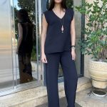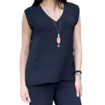 Κομψή μαύρη μπλούζα χωρίς μανίκια με V λαιμόκοψη και ελαφρώς χαλαρή γραμμή. Κατάλληλη για κάθε περίσταση, συνδυάζεται εύκολα τόσο με παντελόνια όσο και με φούστες για ένα σικ αποτέλεσμα.