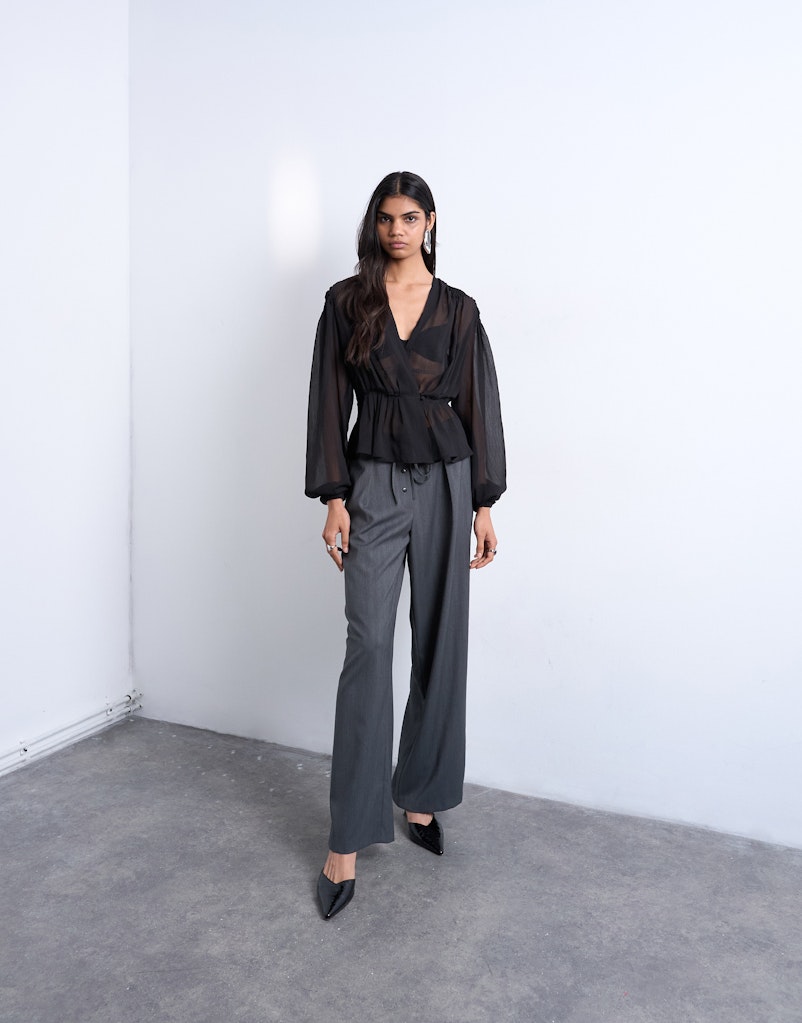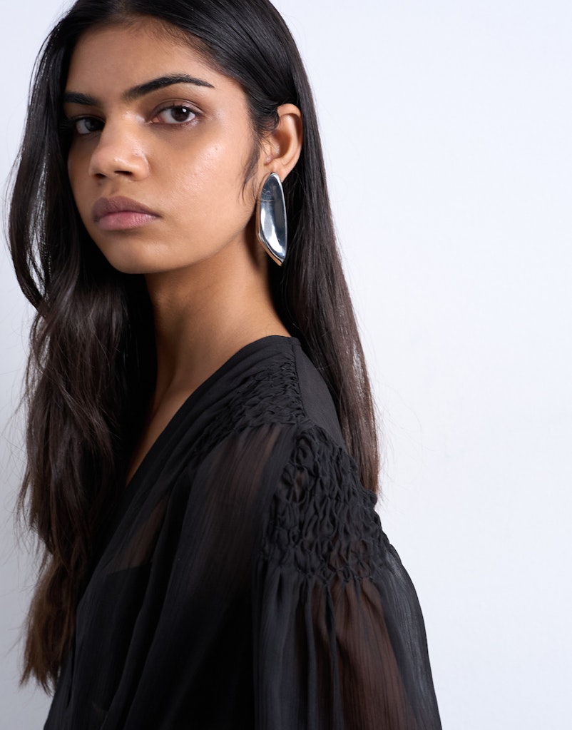 Τα μακριά μανίκια με όγκο προσθέτουν κίνηση και statement χαρακτήρα, ενώ το ελαφρύ ύφασμα χαρίζει διαφάνεια και layering δυνατότητες.