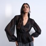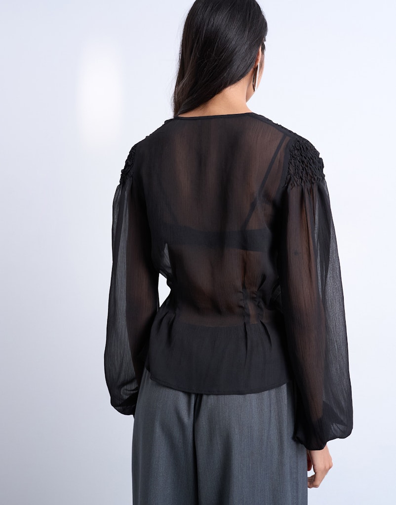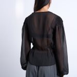 Γυναικεία μπλούζα σε μαύρο χρώμα από διάφανο ύφασμα που προσδίδει αέρινη και κομψή αισθητική. Διαθέτει βαθύ V ντεκολτέ που αναδεικνύει το μπούστο, ενώ η ελαφρώς εφαρμοστή μέση δημιουργεί θηλυκή σιλουέτα.