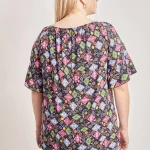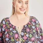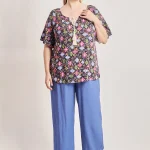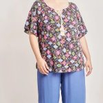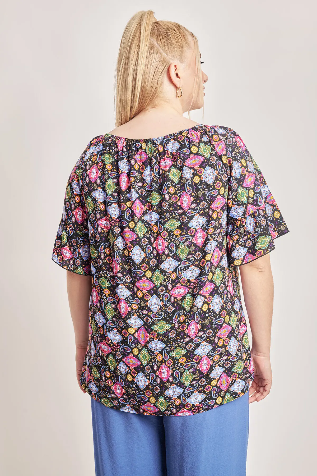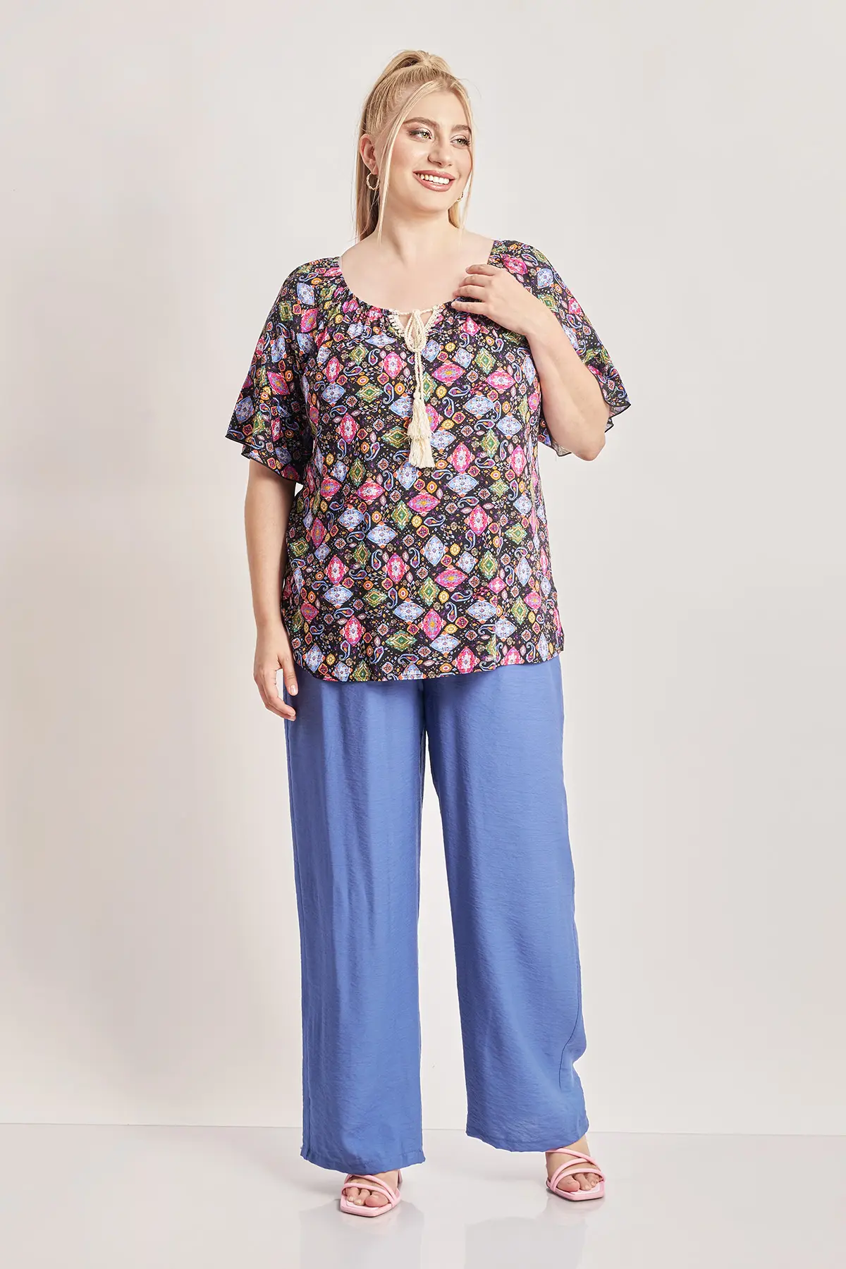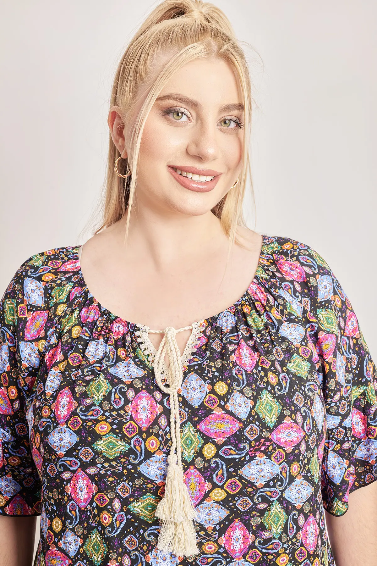 Εμπριμέ μπλούζα βισκόζης με κοντά μανίκια σε boho μοτίβο με λαχούρια. Ελαστική λαιμόκοψη με άνοιγμα. Δέσιμο με κορδόνι και φουντάκια. Το μοντέλο έχει ύψος 177εκ, στήθος 105, μέση 88, περιφέρεια 110 και φοράει μέγεθος 1