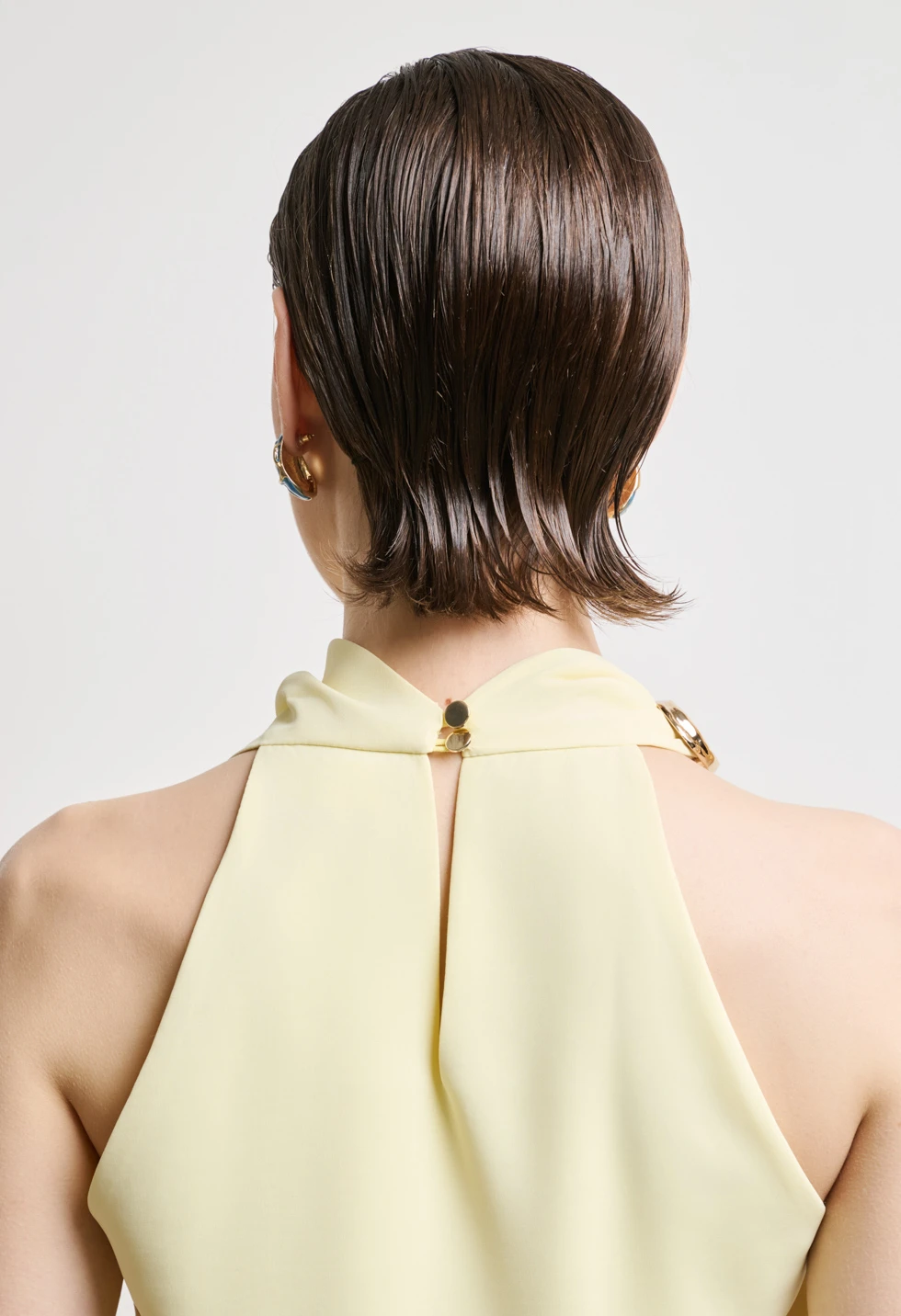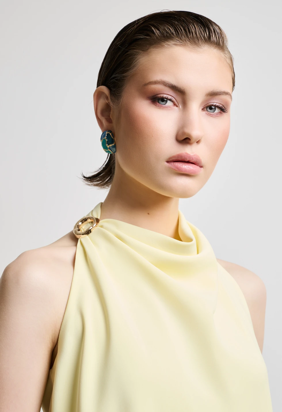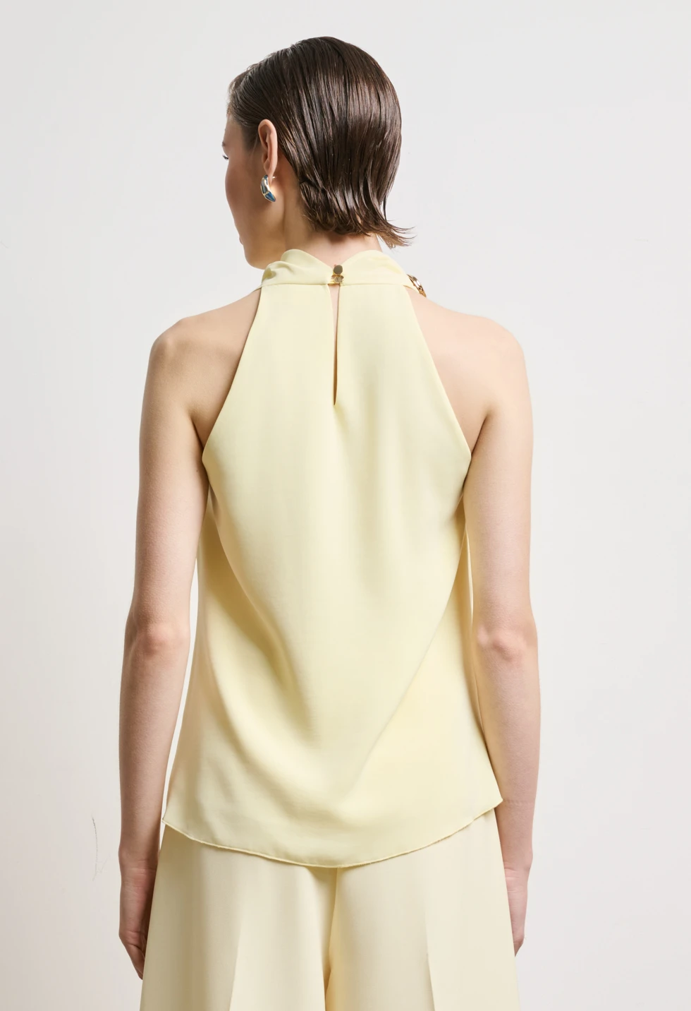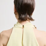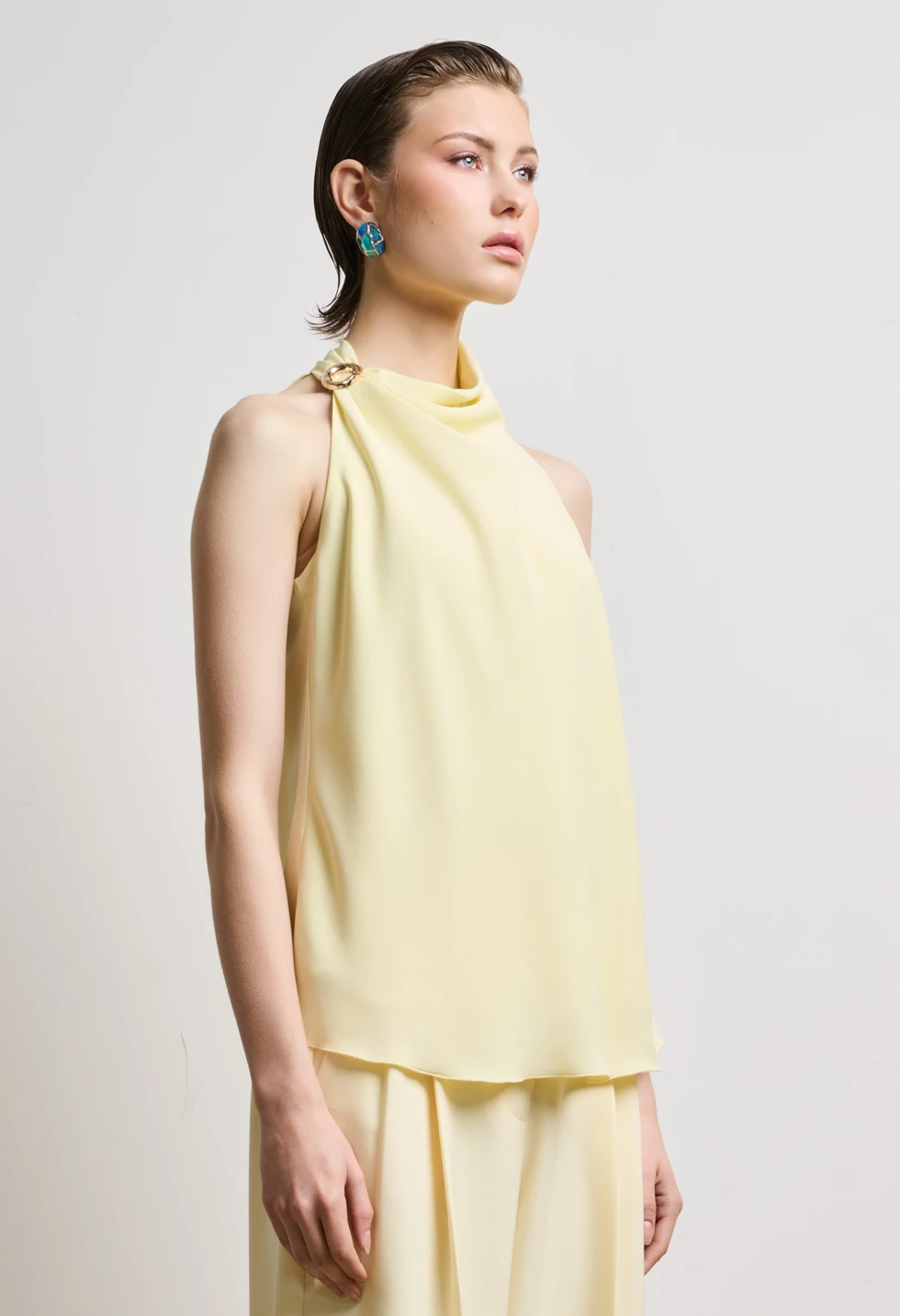 Κομψή μπλούζα halter σε απαλή κίτρινη απόχρωση, σχεδιασμένη με ρευστή γραμμή που αγκαλιάζει το σώμα και χαρίζει elegant κίνηση. Διαθέτει ψηλή λαιμόκοψη halter και διακριτική χρυσή μεταλλική λεπτομέρεια στον ώμο που αναβαθμίζει το minimal σχέδιο. Κλείνει πίσω με κουμπί στον αυχένα, προσφέροντας άνετη εφαρμογή και θηλυκή σιλουέτα. Ιδανική επιλογή για chic εμφανίσεις από το πρωί έως το βράδυ, φοριέται εύκολα με παντελόνια ή φούστες.