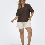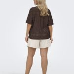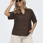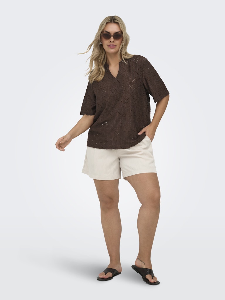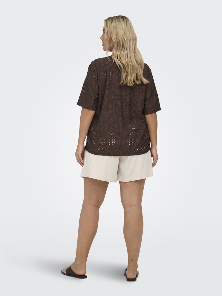 ONLY CARMAKOMA Μπλούζα καφέ. Πρόκειται για ένα εξαιρετικά κομψό και δροσερό γυναικείο τοπ με κοντά μανίκια και θηλυκή λαιμόκοψη σε σχήμα v. Αυτό που την κάνει να ξεχωρίζει είναι το περίτεχνο, all-over διάτρητο κέντημα (broderie), που χαρίζει μια αίσθηση πολυτέλειας, διακριτική διαφάνεια και ρετρό αισθητική.