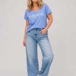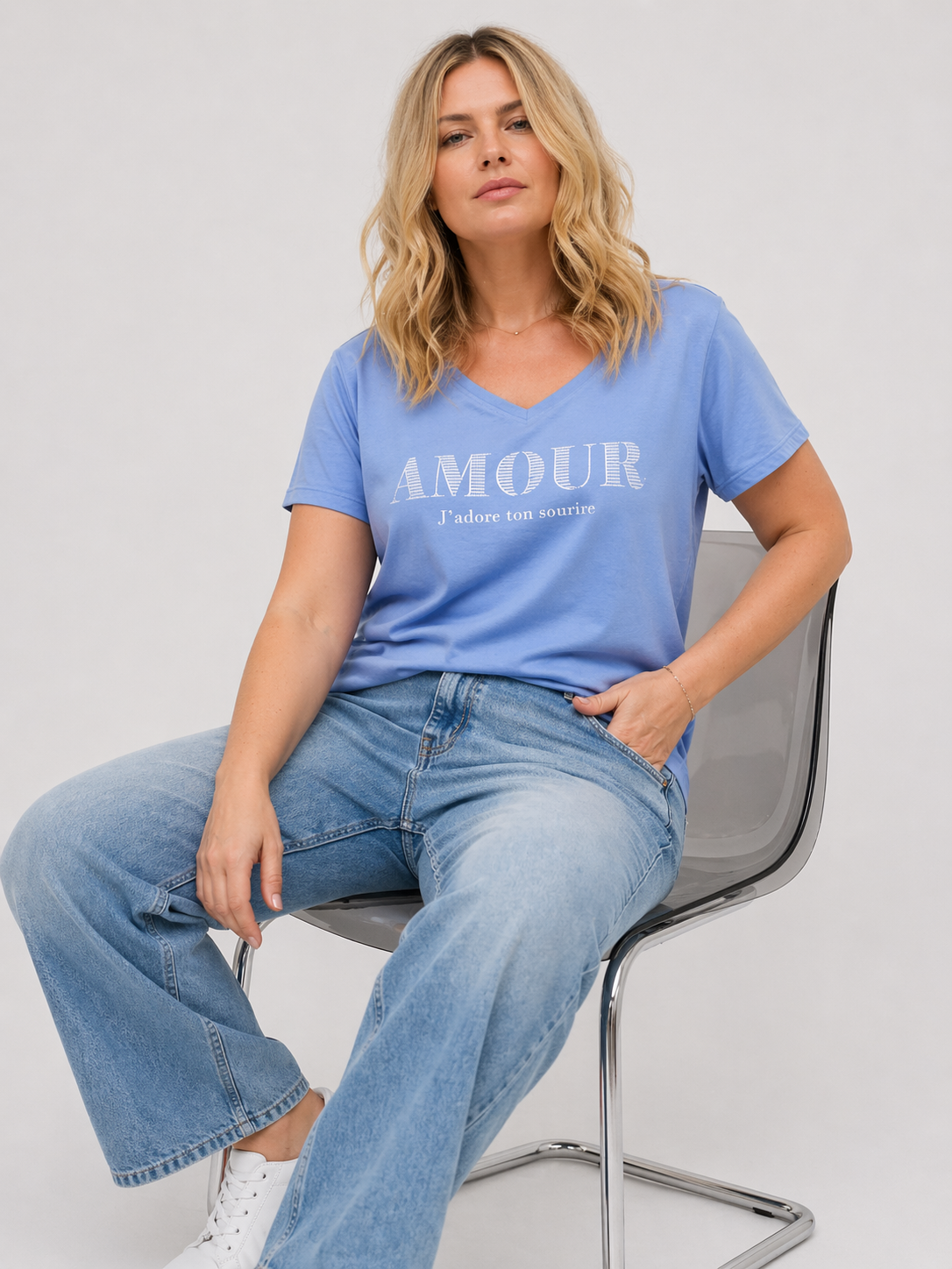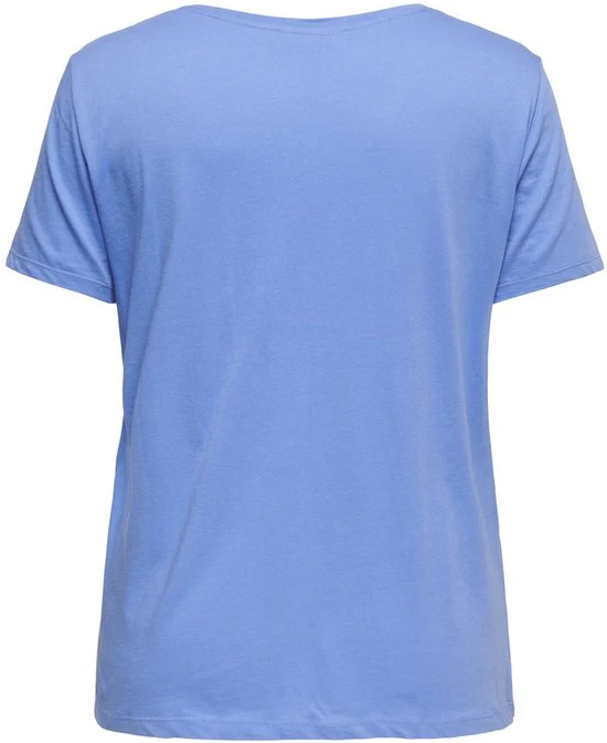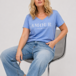 ONLY CARMAKOMA Μπλούζα γαλάζια. Πρόκειται για ένα δροσερό και εξαιρετικά ευέλικτο γυναικείο t-shirt, το οποίο μαγνητίζει τα βλέμματα χάρη στην κομψή στάμπα στο στήθος με το μήνυμα Amour, αποπνέοντας αισιοδοξία και θετική ενέργεια. Διαθέτει κολακευτική λαιμόκοψη σε σχήμα v που αναδεικνύει όμορφα το ντεκολτέ και κλασικά κοντά μανίκια.
