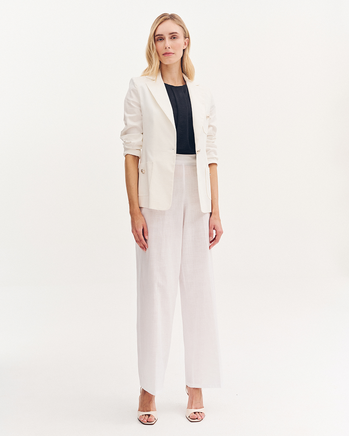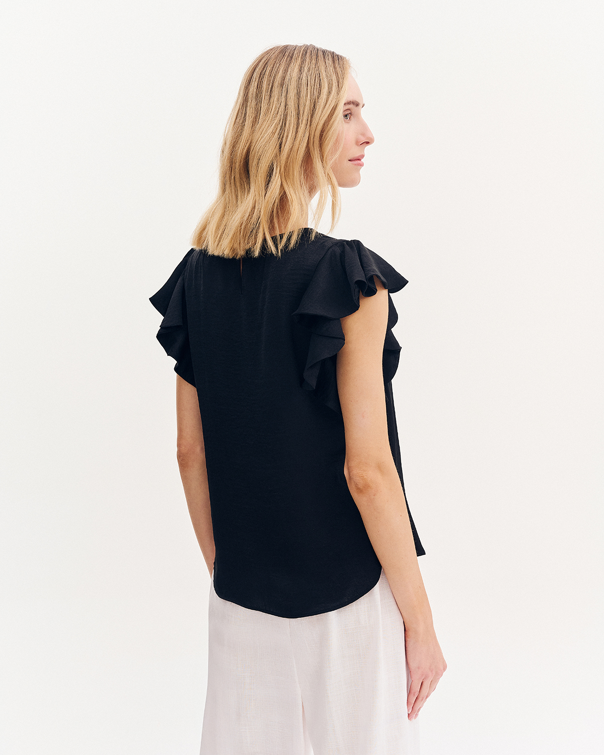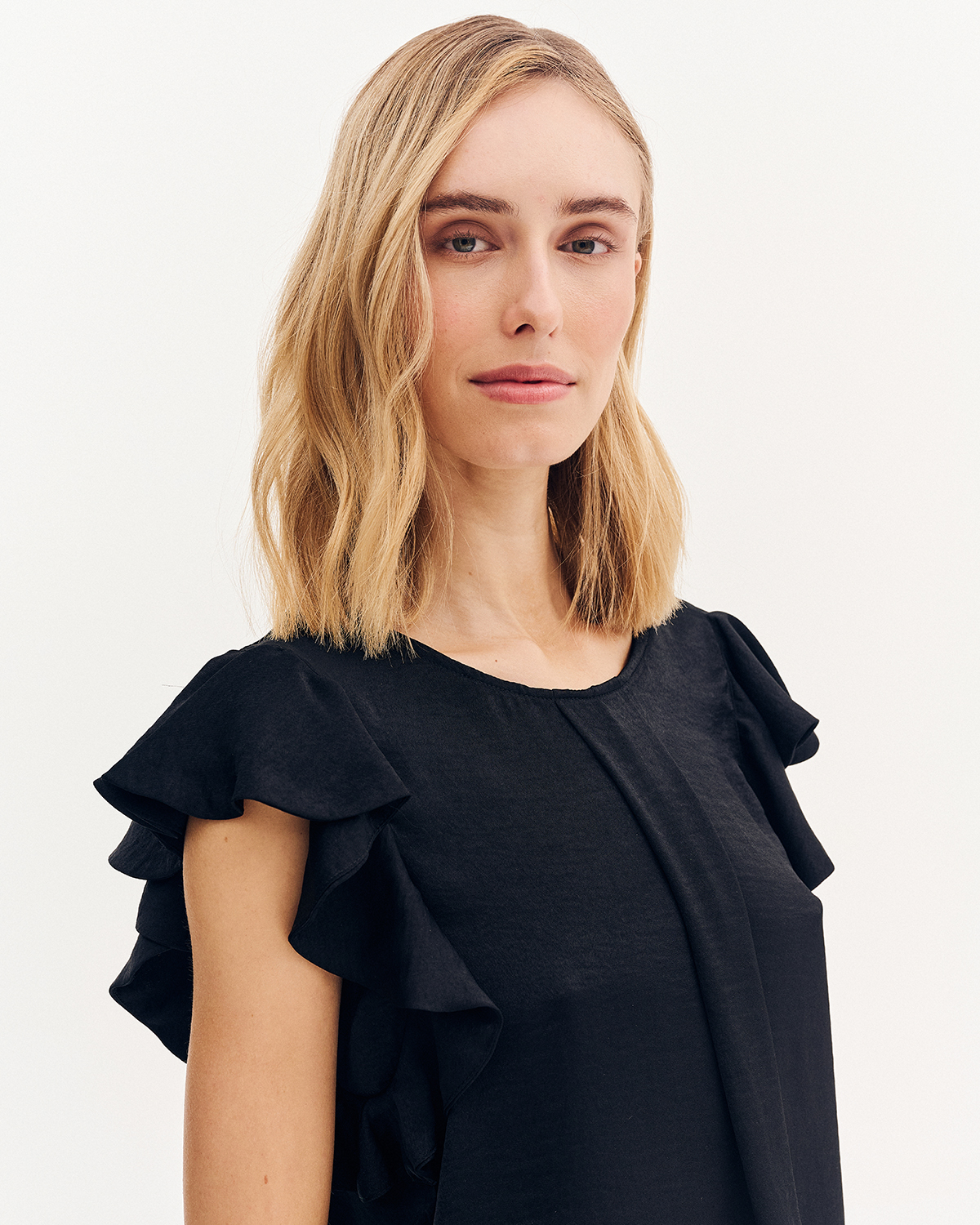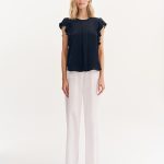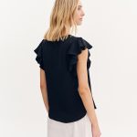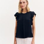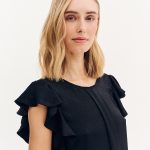 Μπλούζα με βολάν στο μανίκι. Στρογγυλή λαιμόκοψη και πίετα στο μπροστινό μέρος.