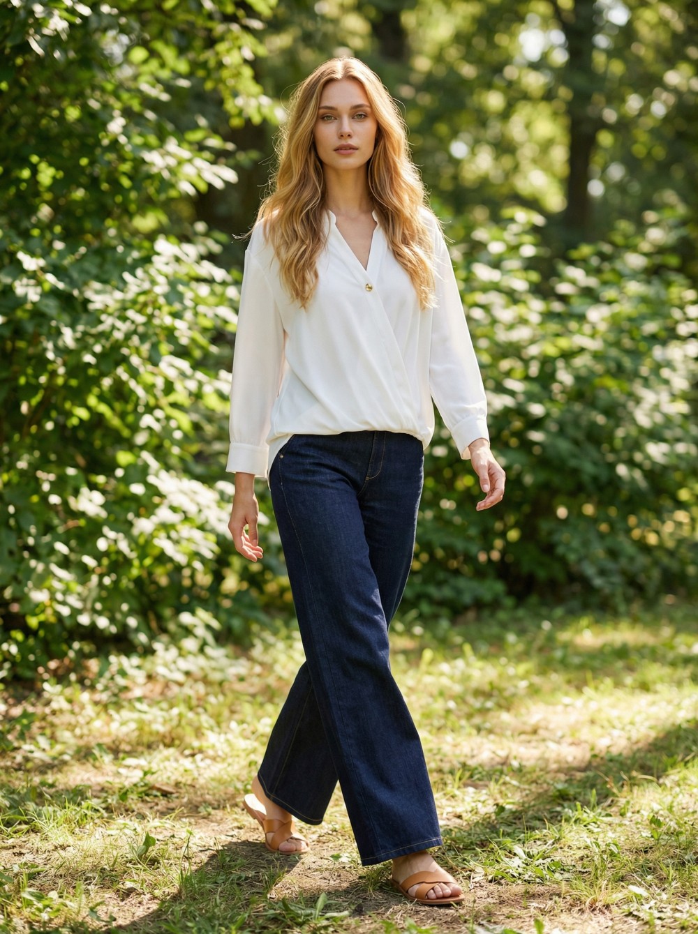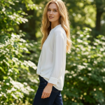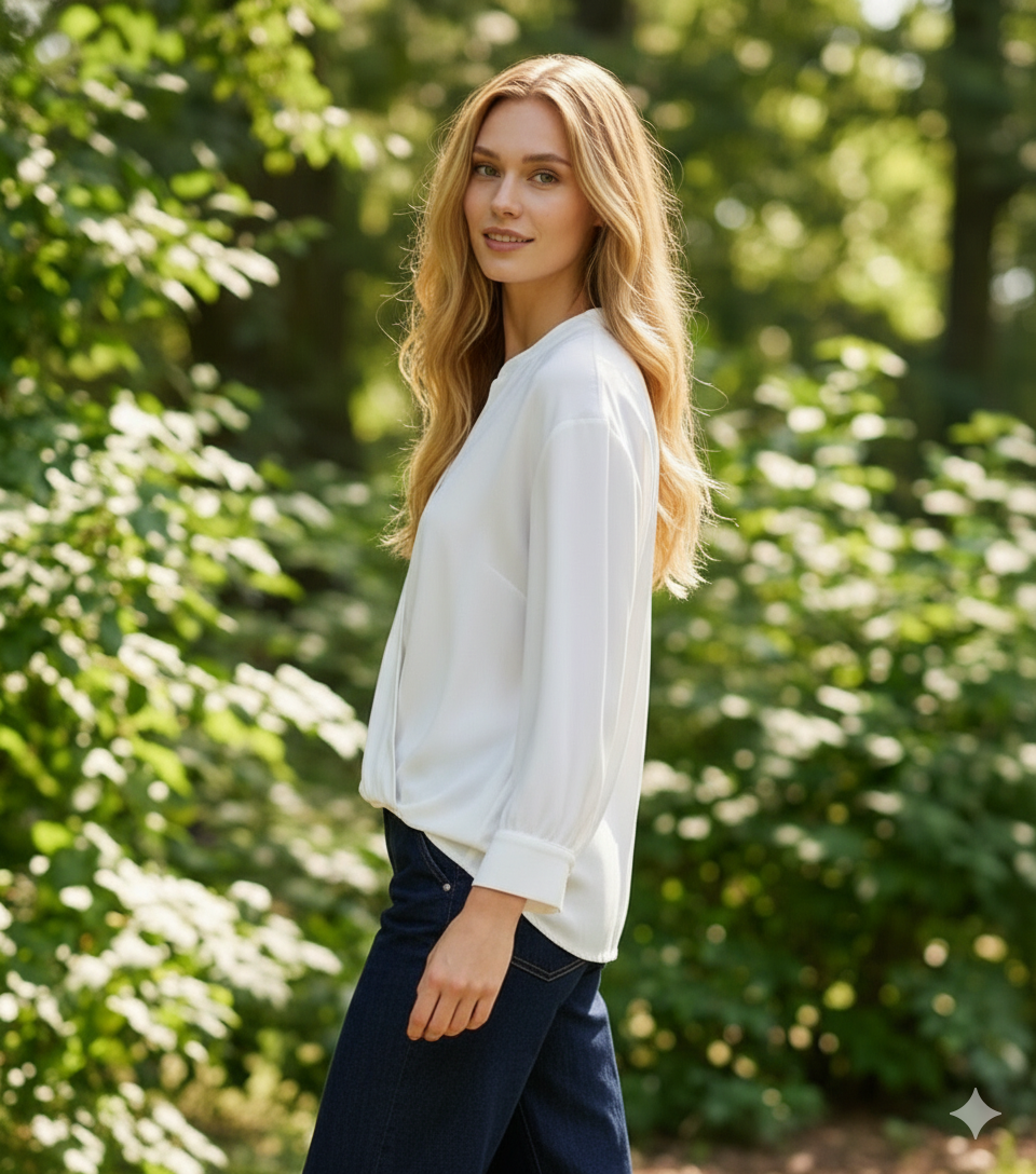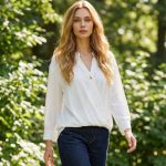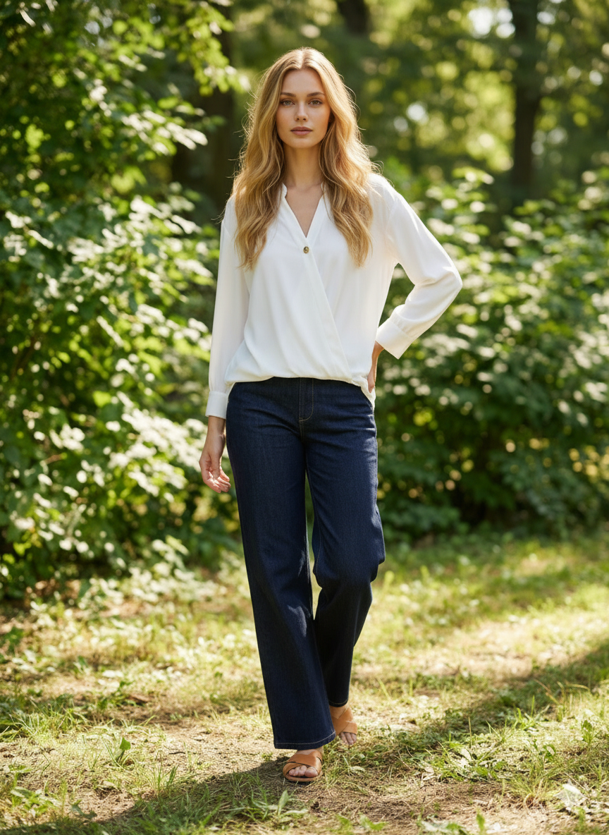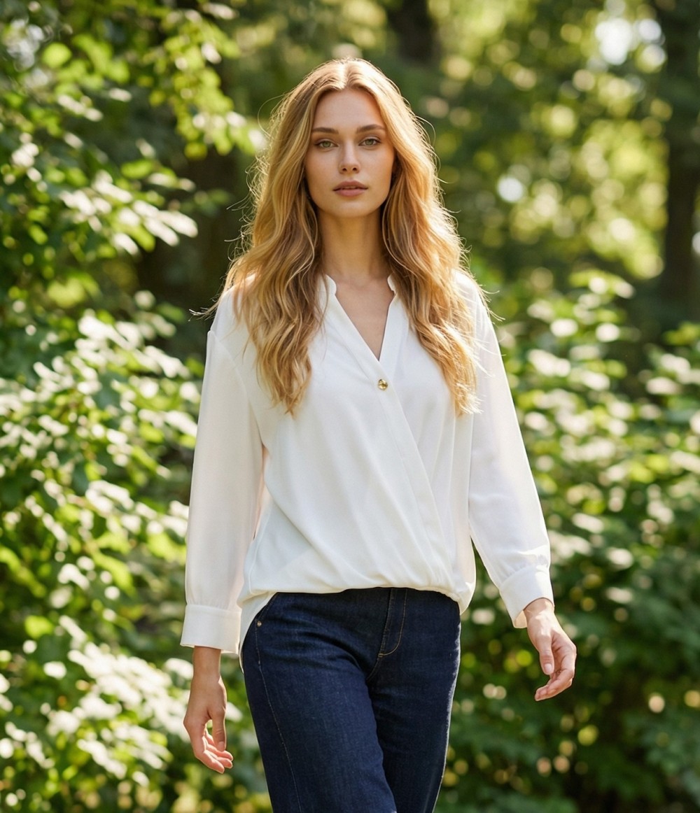 DERPOULI μπλούζα λευκή, ένα διαχρονικό κομμάτι που συνδυάζει την απλότητα με την απόλυτη κομψότητα. Πρόκειται για μια εντυπωσιακή γυναικεία μπλούζα κρουαζέ με μακριά μανίκια, η οποία δημιουργεί ένα κολακευτικό ντεκολτέ σε σχήμα V, αναδεικνύοντας υπέροχα το μπούστο. Η διακριτική χρυσή λεπτομέρεια στο μπροστινό μέρος προσθέτει μια πινελιά πολυτέλειας.