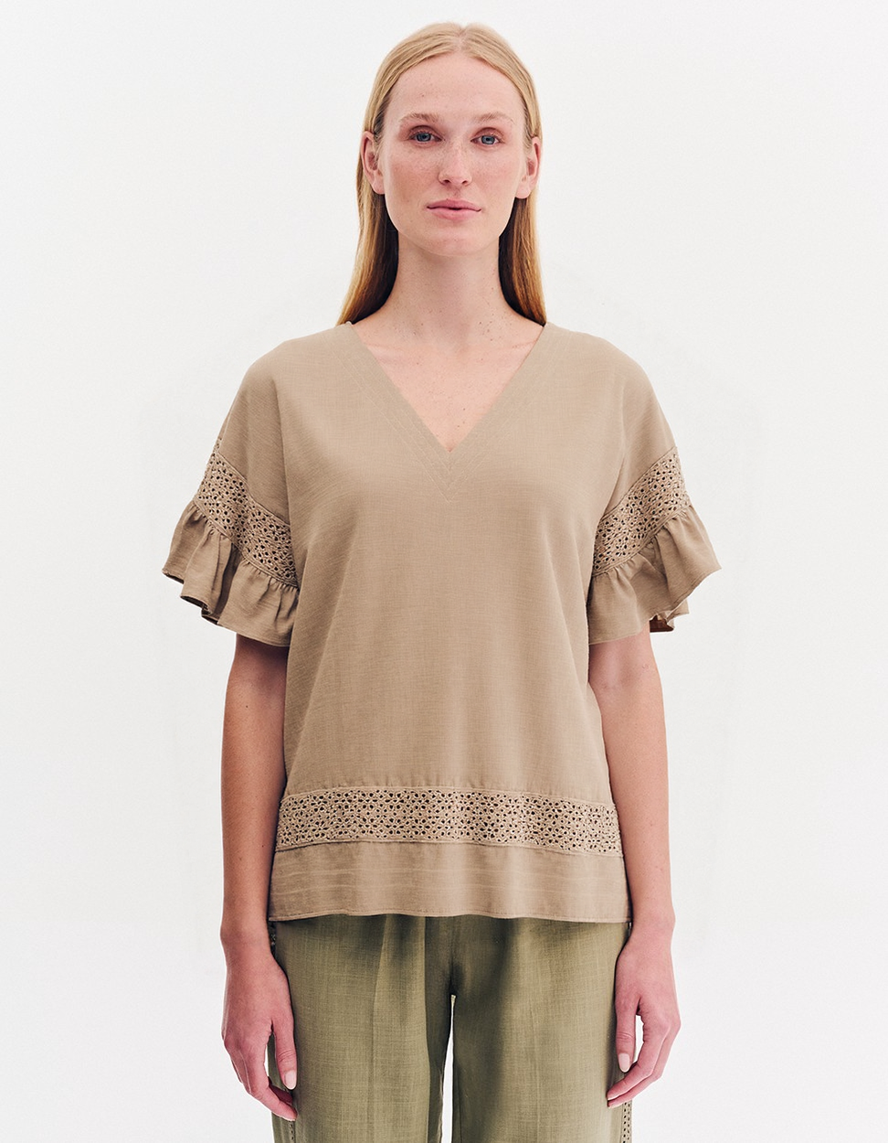 Μπλούζα με ”V” ντεκολτέ και κοντό μανίκι που καταλήγει σε βολάν. Λεπτομέρεια, με διάτρητο σχέδιο σε ασορτί χρωματικό συνδυασμό.