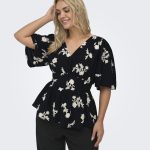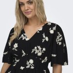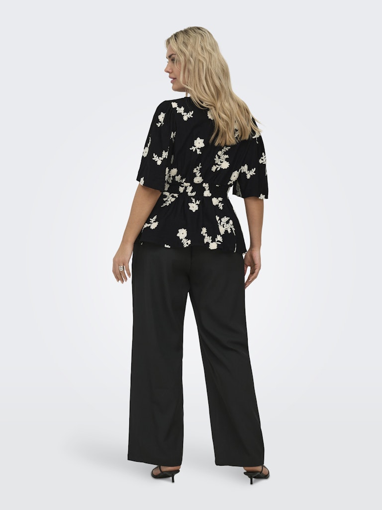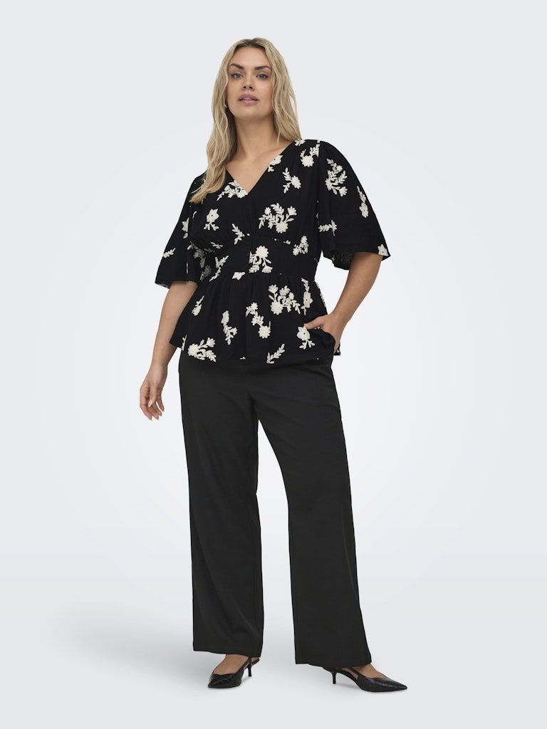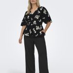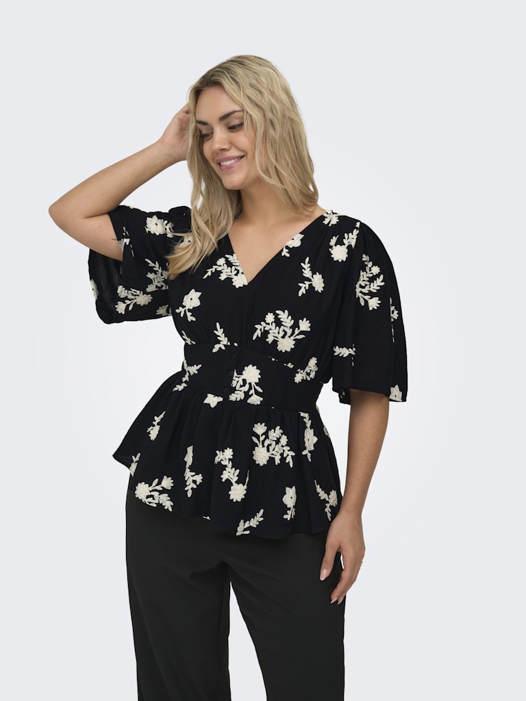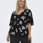 ONLY CARMAKOMA Μπλούζα μαύρη, μια εξαιρετικά κομψή και ρομαντική επιλογή. Πρόκειται για ένα εντυπωσιακό γυναικείο τοπ, το οποίο μαγνητίζει τα βλέμματα χάρη στο περίτεχνο λευκό φλοράλ κέντημα που διακοσμεί όλη την επιφάνειά του. Διαθέτει κολακευτική λαιμόκοψη σε σχήμα v και αέρινα, φαρδιά μανίκια που χαρίζουν άνεση.