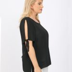 Μονόχρωμη μπλούζα μουσελίνα με πέρλες στο μανίκι.
