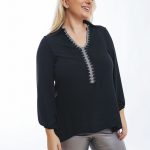 Μπλούζα με στρας στο V σε μαύρο χρώμα σε μεγάλα μεγέθη.Έχει V λαιμόκοψη με στρας περιμετρικά και κάτω από το V και μακριά μανίκια.Η εφαρμογή της είναι κανονική, η γραμμή της είναι άλφα και το ύφασμα σταθερό.