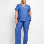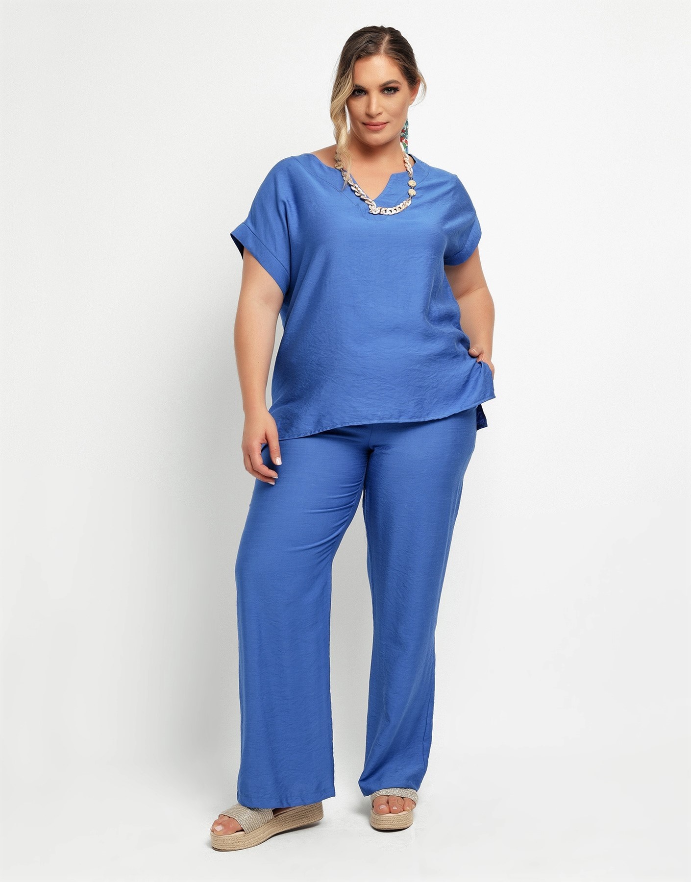 Μονόχρωμη μπλούζα ρεγιόν με όψη λινού. V λαιμόκοψη. Κοντά ρεγκλάν μανίκια. Διατίθεται μαζί με κολιέ που δύναται να διαφέρει από αυτό της φωτογραφίας του είδους. Συμπληρώστε το σετ με την παντελόνα 240410853. Το μοντέλο έχει ύψος 179 εκ, στήθος 109, μέση 89, περιφέρεια 119 και φοράει το μέγεθος 1